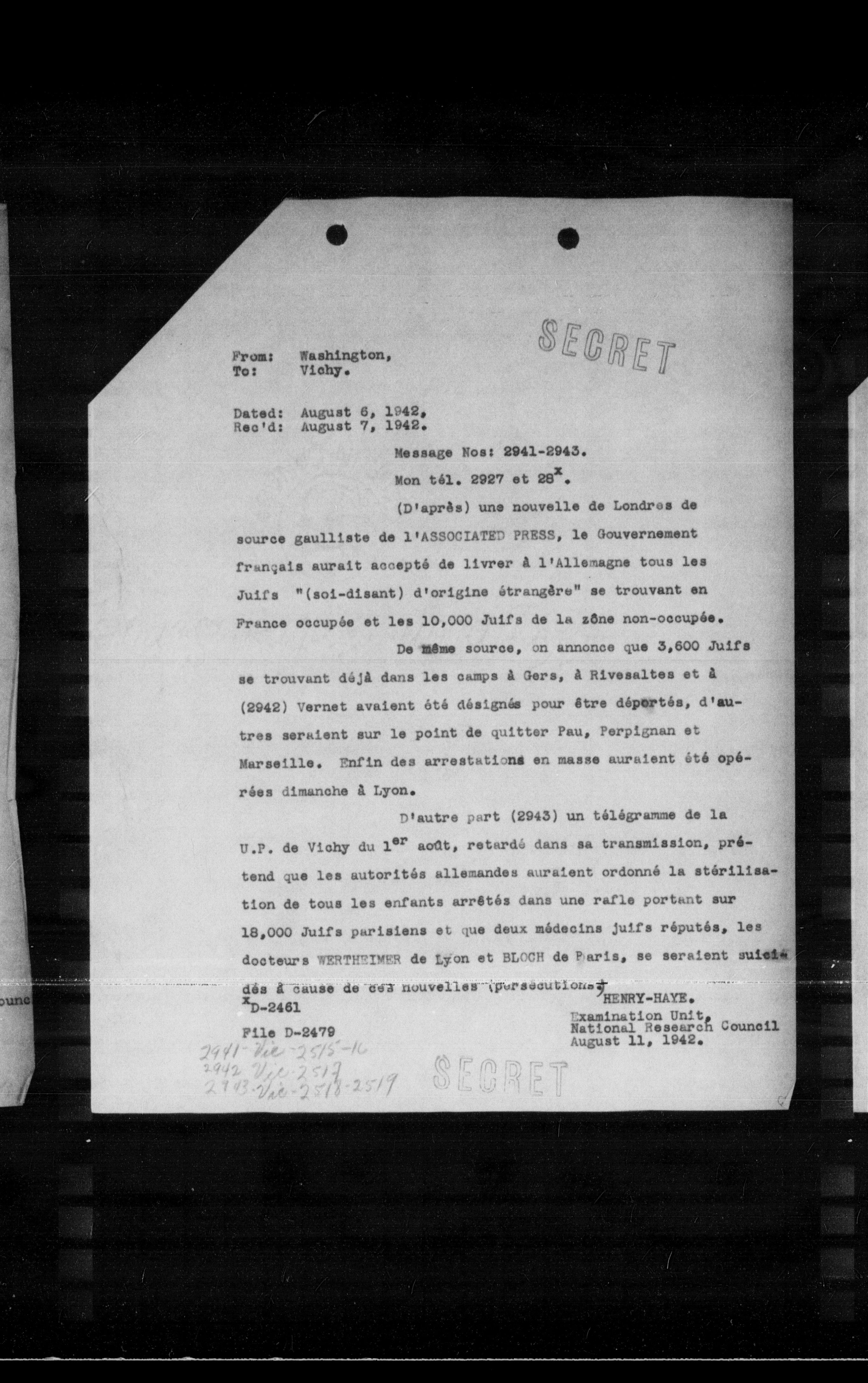 source gaulliste de l'ASSOCIATED PRESS, le Gouvernement français aurait accepté de livrer à l'Allemagne tous les Juifs "(soi-disant) d'origine étrangère" se trouvant en France occupée et les 10,000 Juifs de la zône non-occupée.