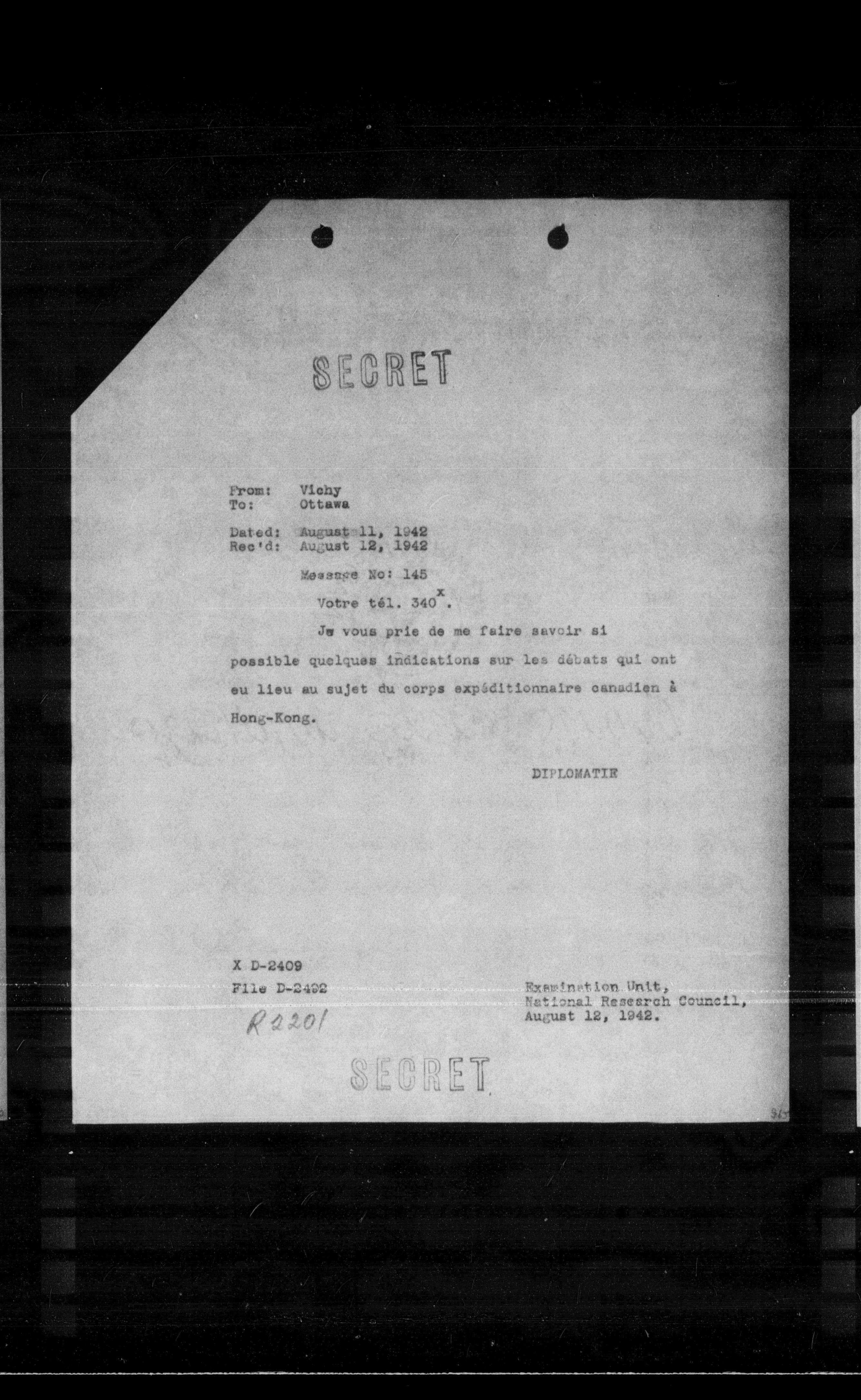 Je vous prie de me faire savoir si possible quelques indications sur les débats qui ont eu lieu au sujet du corps expéditionnaire canadien à Hong-Kong.