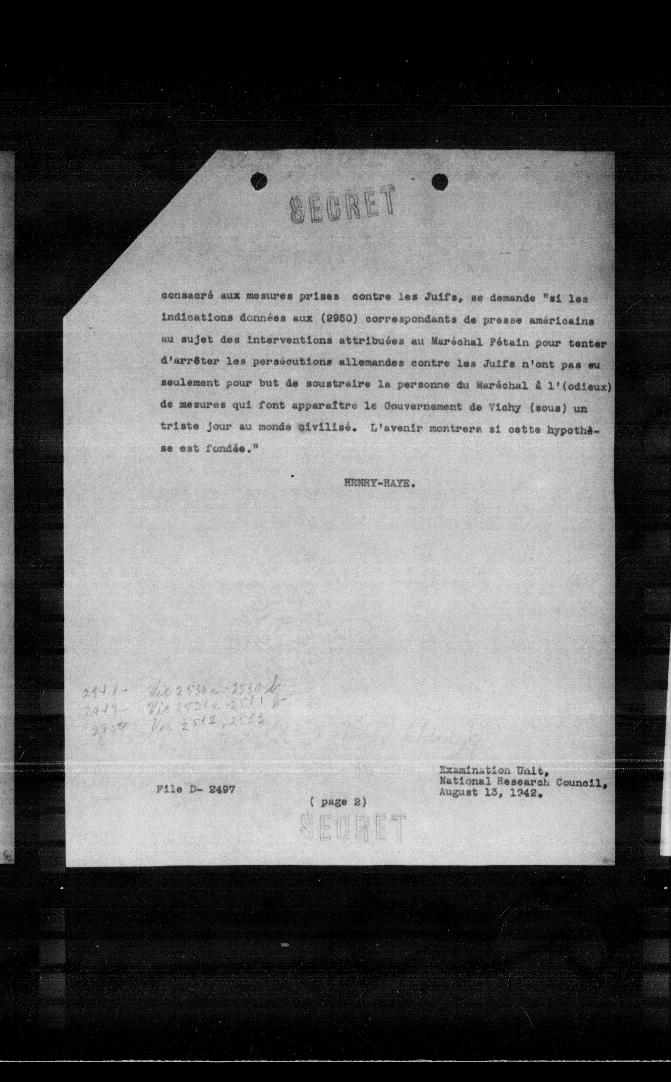 consacré aux mesures prises contre les Juifs, se demande "si les indications données aux (2980) correspondants de presse américains au sujet des interventions attribuées au Maréchal Pétain pour tenter d'arrêter les persécutions allemandes contre les Juifs n'ont pas eu seulement pour but de soustraire la personne du Maréchal à l'individu de mesures qui font apparaître le Gouvernement de Vichy (sous) un triste jour au monde civilisé. L'avenir montrera si cette hypothèse est fondée."