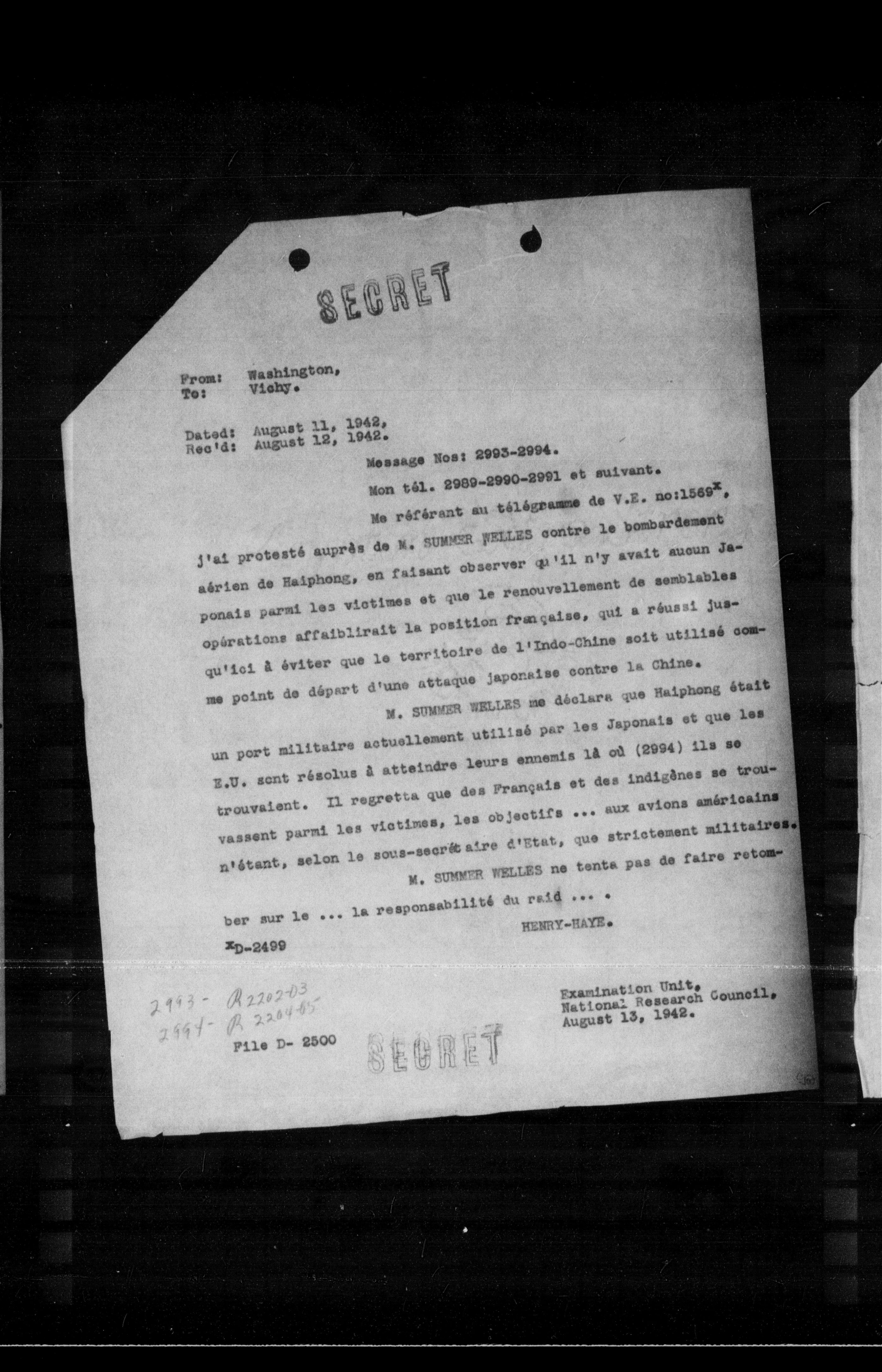 M. SUMMER WELLES me déclara que Haiphong était un port militaire actuellement utilisé par les Japonais et que les E.U. sont résolus à atteindre leurs ennemis 18 ou (2994) ils se trouvaient. Il regretta que des Français et des Indigènes se trouvassent parmi les victimes, les objectifs ... aux avions américains n'étant, selon le sous-secrétaire d'Etat, que strictement militaires.
