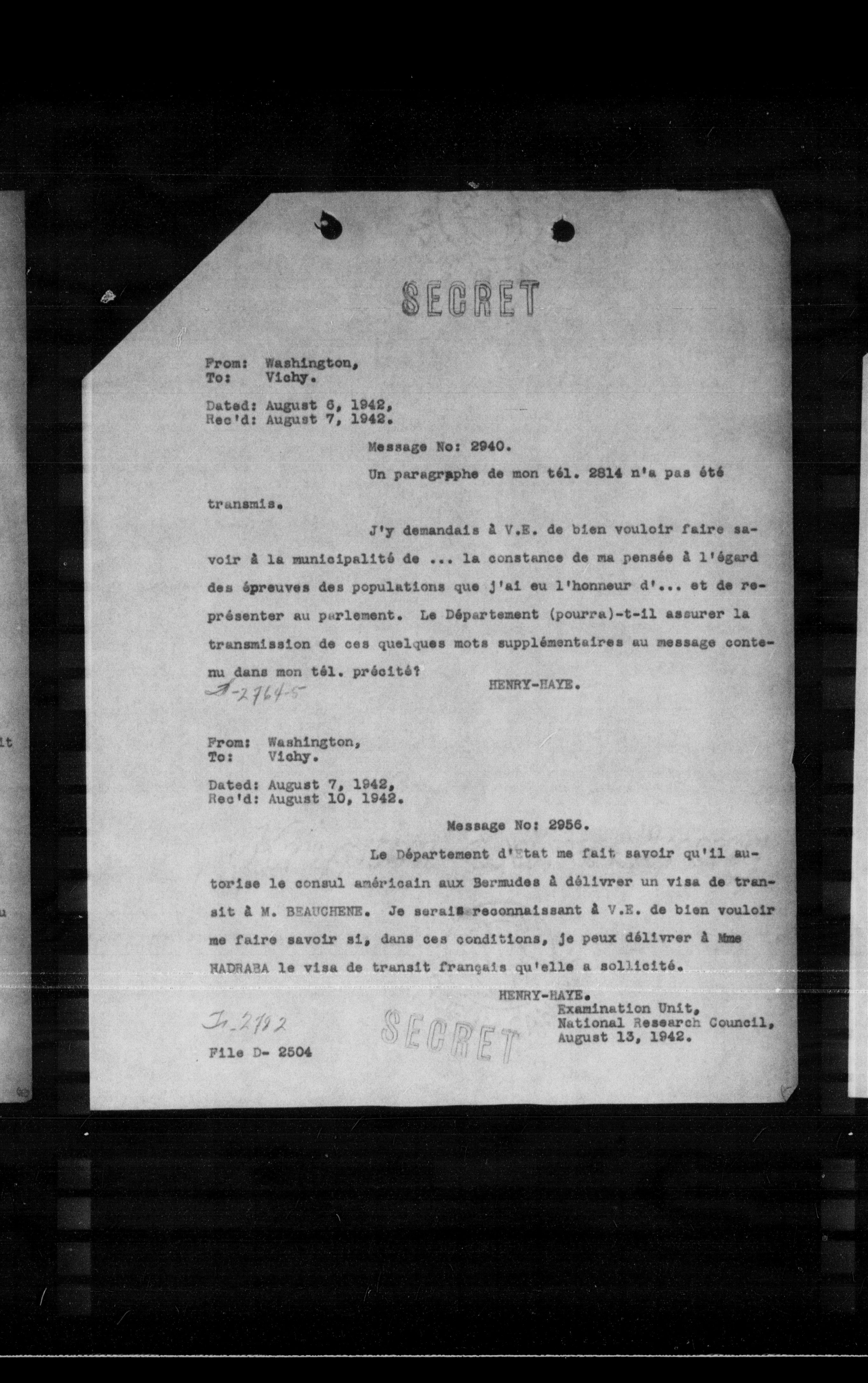 **From:** Washington, **To:** Vichy.