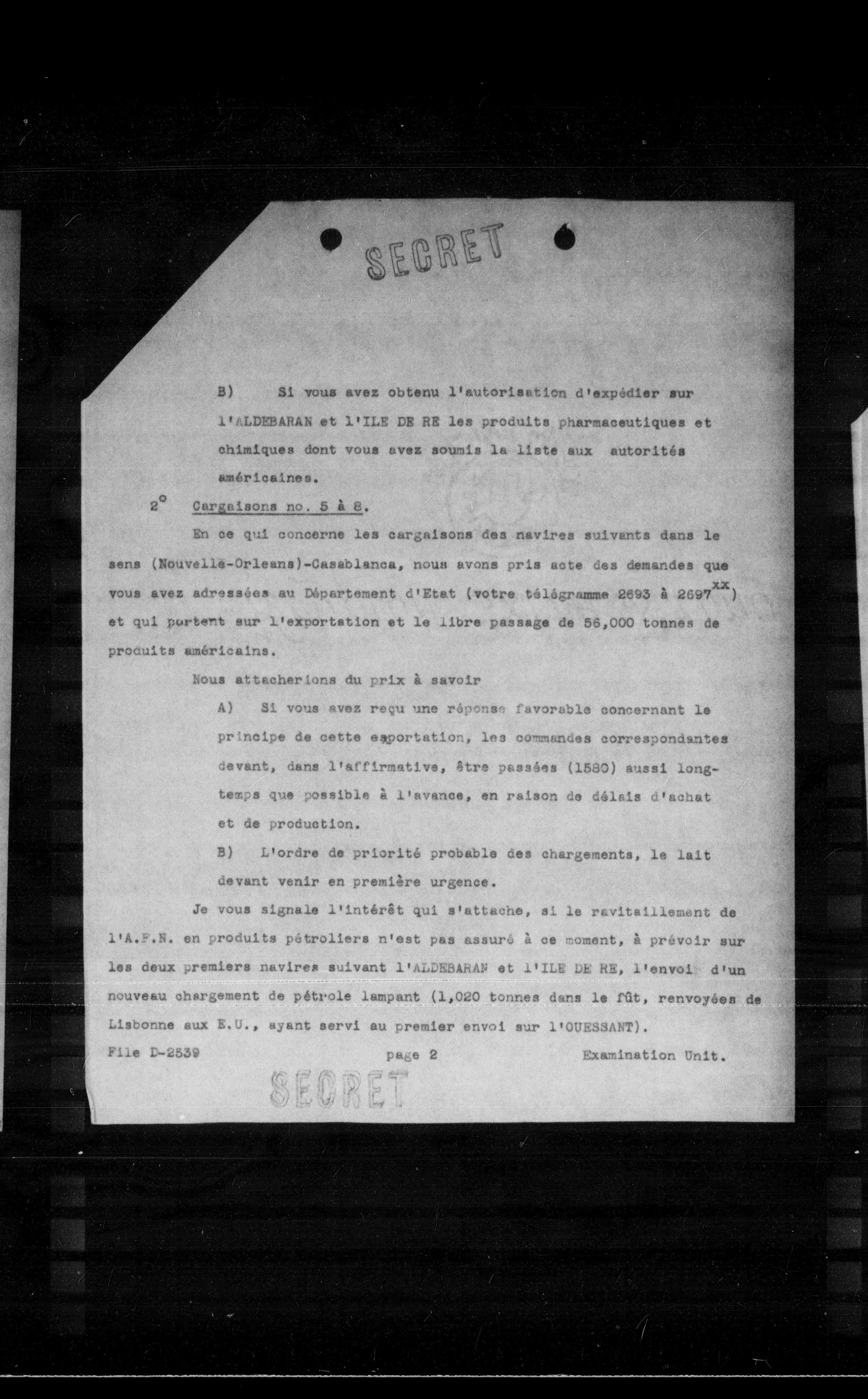 En ce qui concerne les cargaisons des navires suivants dans le sens (Nouvelle-Orleans)-Casablanca, nous avons pris acte des demandes que vous avez adressées au Département d'Etat (votre tólógramme 2693 à $2697^{2 x}$ ) et qui portent sur l'exportation et le libre passage de 58,000 tonnes de produits américains.