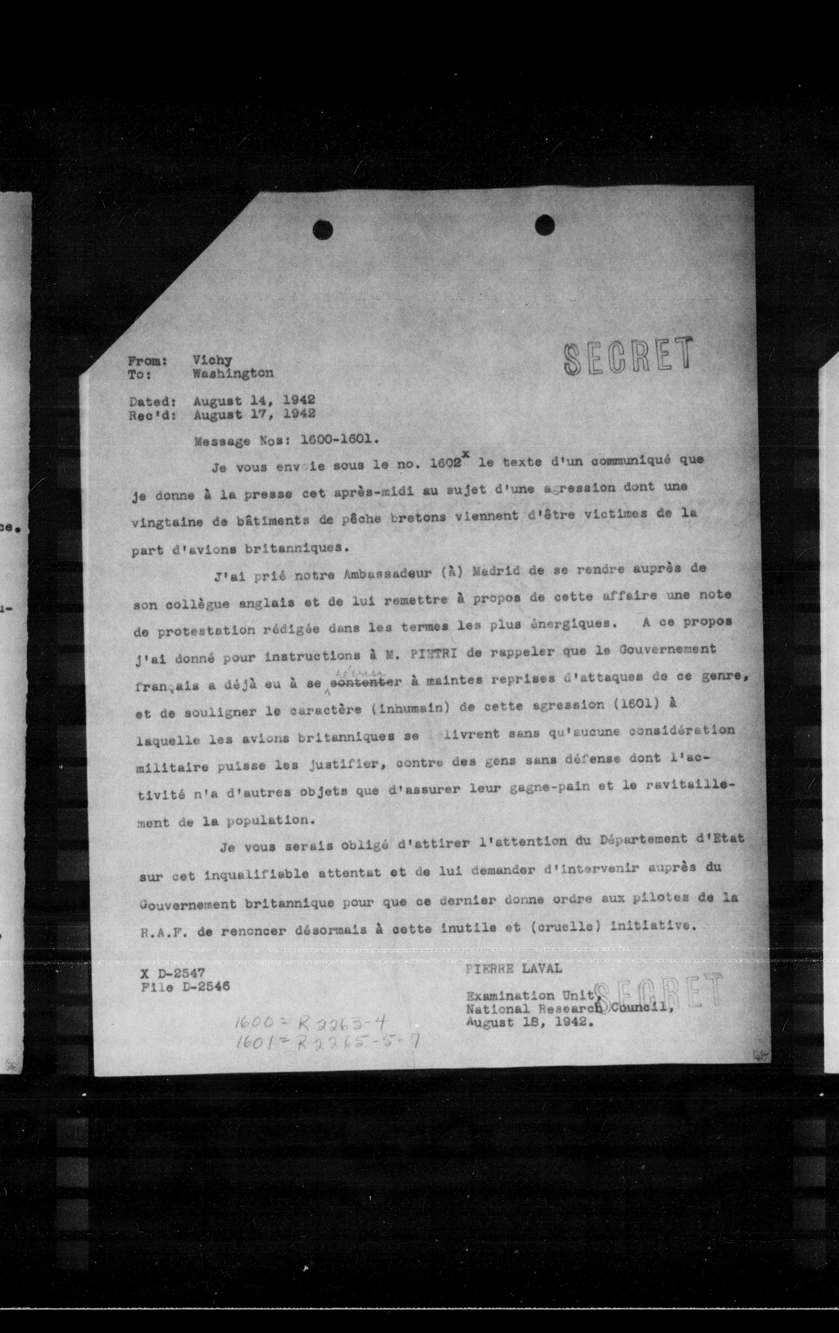 Je vous envele sous le no. $1602^{\circ}$ le texte d'un communiqué que je donne à la presse cet après-midi au sujet d'une a ression dont une vingtaine de bâtiments de pêche bretons viennent d'âtre victimes de la part d'avions britanniques.