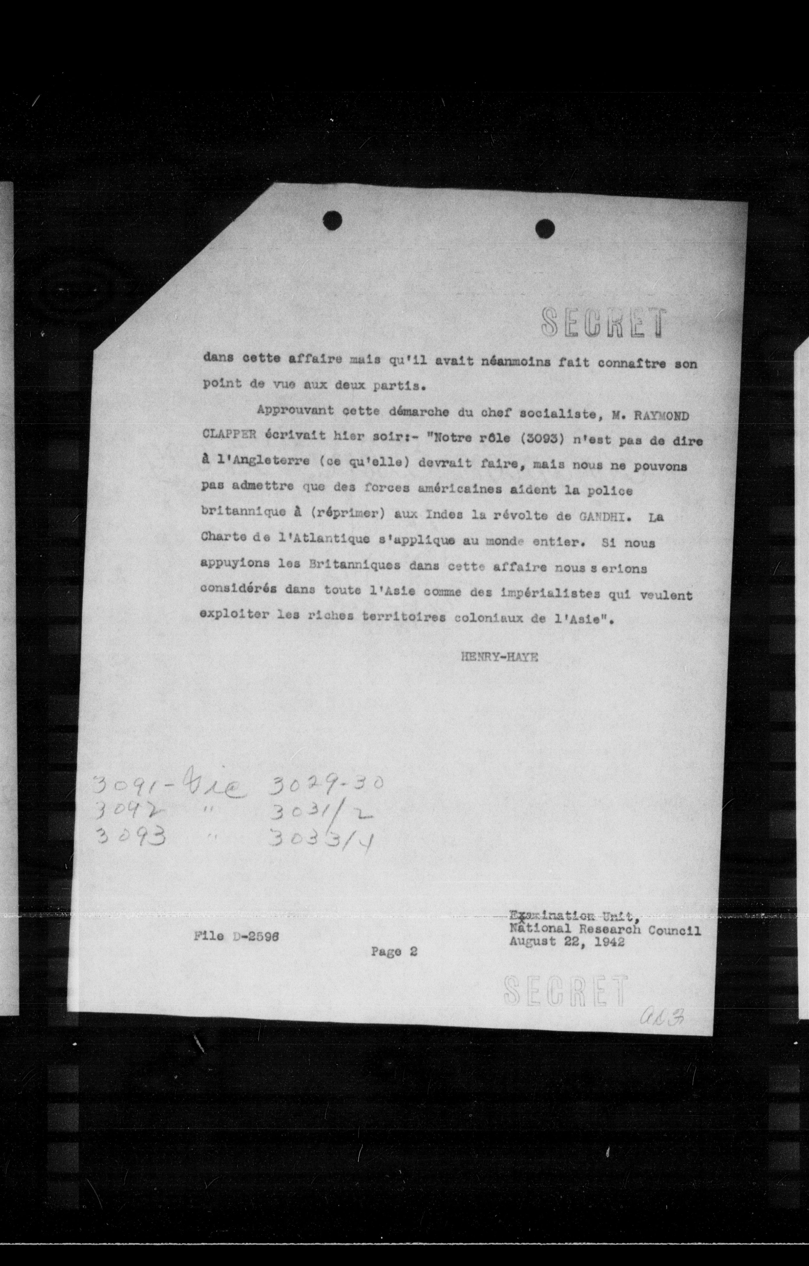 Approuvant cette démarche du chef socialiste, M. RAYMOND CLAPPER écrivait hier soir:- "Notre rôle (3093) n'est pas de dire a l'Angleterre (ce qu'elle) devrait faire, mais nous ne pouvons pas admettre que des forces américaines aident la police britannique a (réprimer) aux Indes la révolte de GANDHI. La Charte de l'Atlantique s'applique au monde entier. Si nous appuyions les Britanniques dans cette affaire nous serions considérés dans toute l'Asie comme des impérialistes qui veulent exploiter les riches territoires coloniaux de l'Asie".