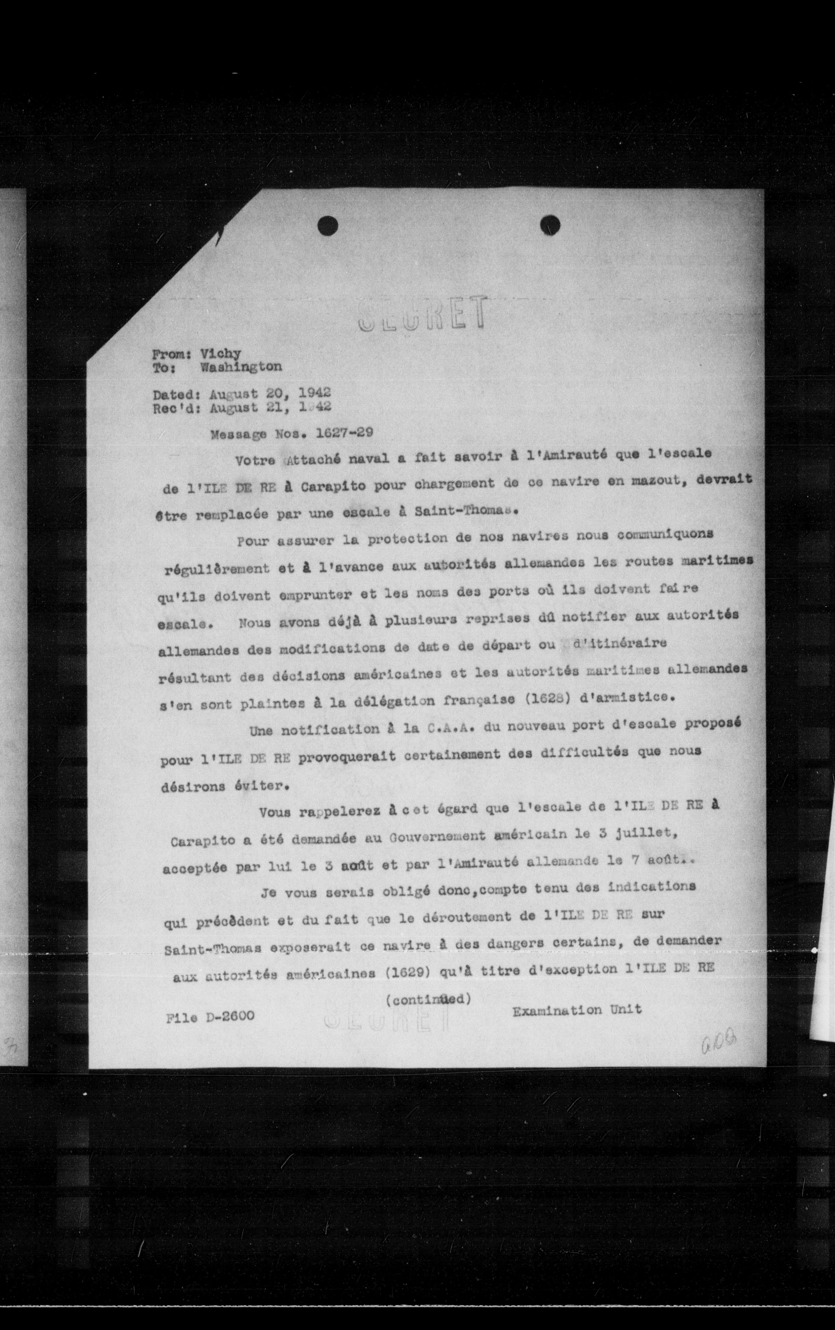 Pour assurer la protection de nos navires nous communiquons régulièrement et à l'avance aux autorités allemandes les routes maritimes qu'ils doivent emprunter et les noms des ports où ils doivent faire escale. Nous avons déjà à plusieurs reprises dû notifier aux autorités allemandes des modifications de date de départ ou d'itinéraire résultant des décisions américaines et les autorités maritimes allemandes s'en sont plaintes à la délégation française (1628) d'armistice.