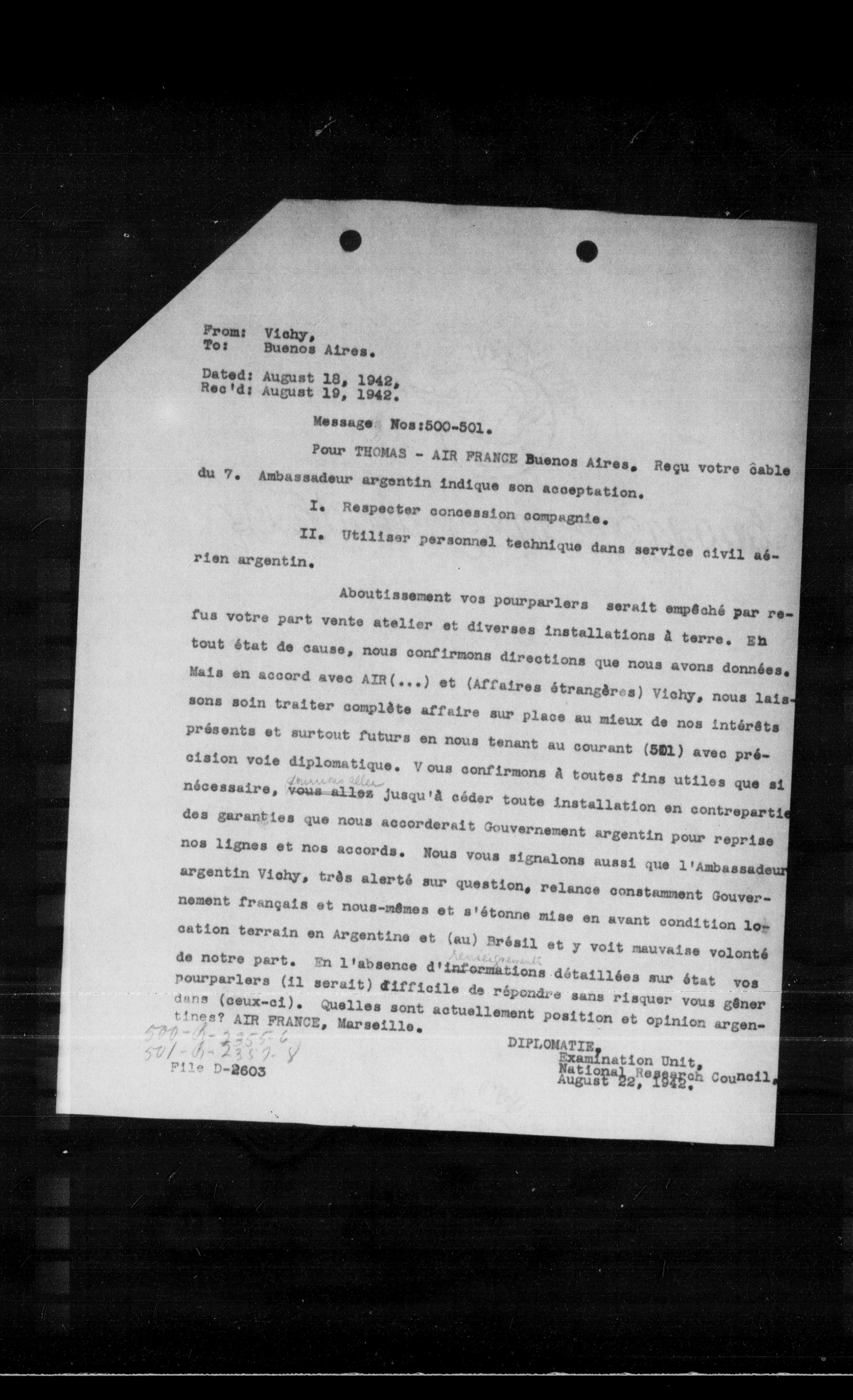 Pour THOMAS - AIR FRANCE Buenos Aires. Reçu votre câble du 7. Ambassadeur argentin indique son acceptation.
