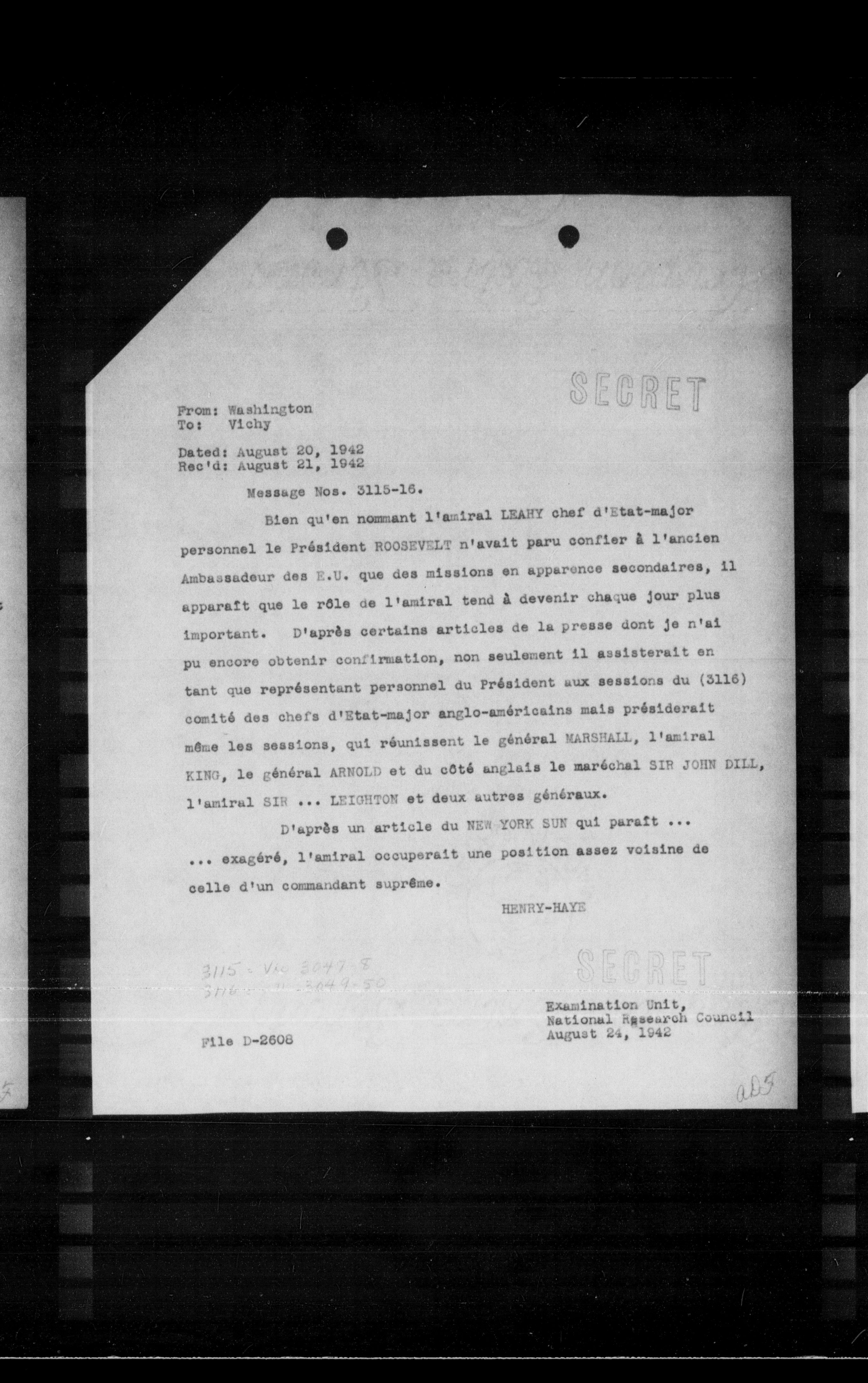 Bien qu'en nomant l'amiral LEARY chef d'Etat-major personnel le Président ROOSEVELT n'avait paru confier à l'ancien Ambassadeur des E.U. que des missions en apparence secondaires, il apparait que le rôle de l'amiral tend à devenir chaque jour plus important. D'après certains articles de la presse dont je n'ai pu encore obtenir confirmation, non seulement il assisterait en tant que représentant personnel du Président aux sessions du (3116) comité des chefs d'Etat-major anglo-américains mais présiderait même les sessions, qui réunissent le général MARSHALL, l'amiral KING, le général ARNOLD et du côté anglais le maréchal SIR JOHN DILL, l'amiral SIR ... LEIGHTON et deux autres généraux.