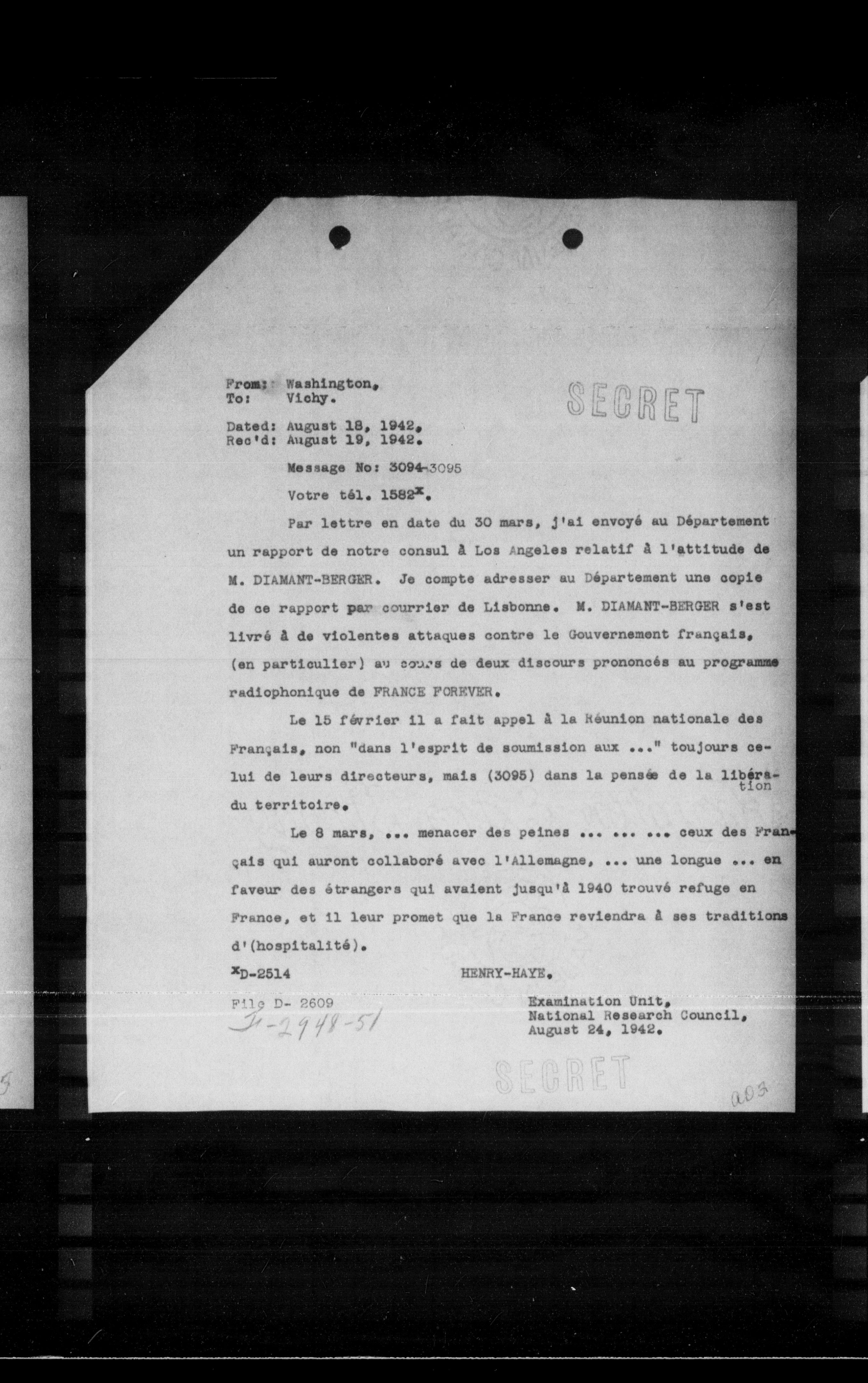 Par lettre en date du 30 mars, j'ai envoyé au Département un rapport de notre consul à Los Angeles relatif à l'attitude de M. DIAMANT-BERGER. Je compte adresser au Département une copie de ce rapport par courrier de Lisbonne. M. DIAMANT-BERGER s'est livré à de violentes attaques contre le Gouvernement français, (en particulier) au cours de deux discours prononcés au programme radiophonique de FRANCE FOREVER.