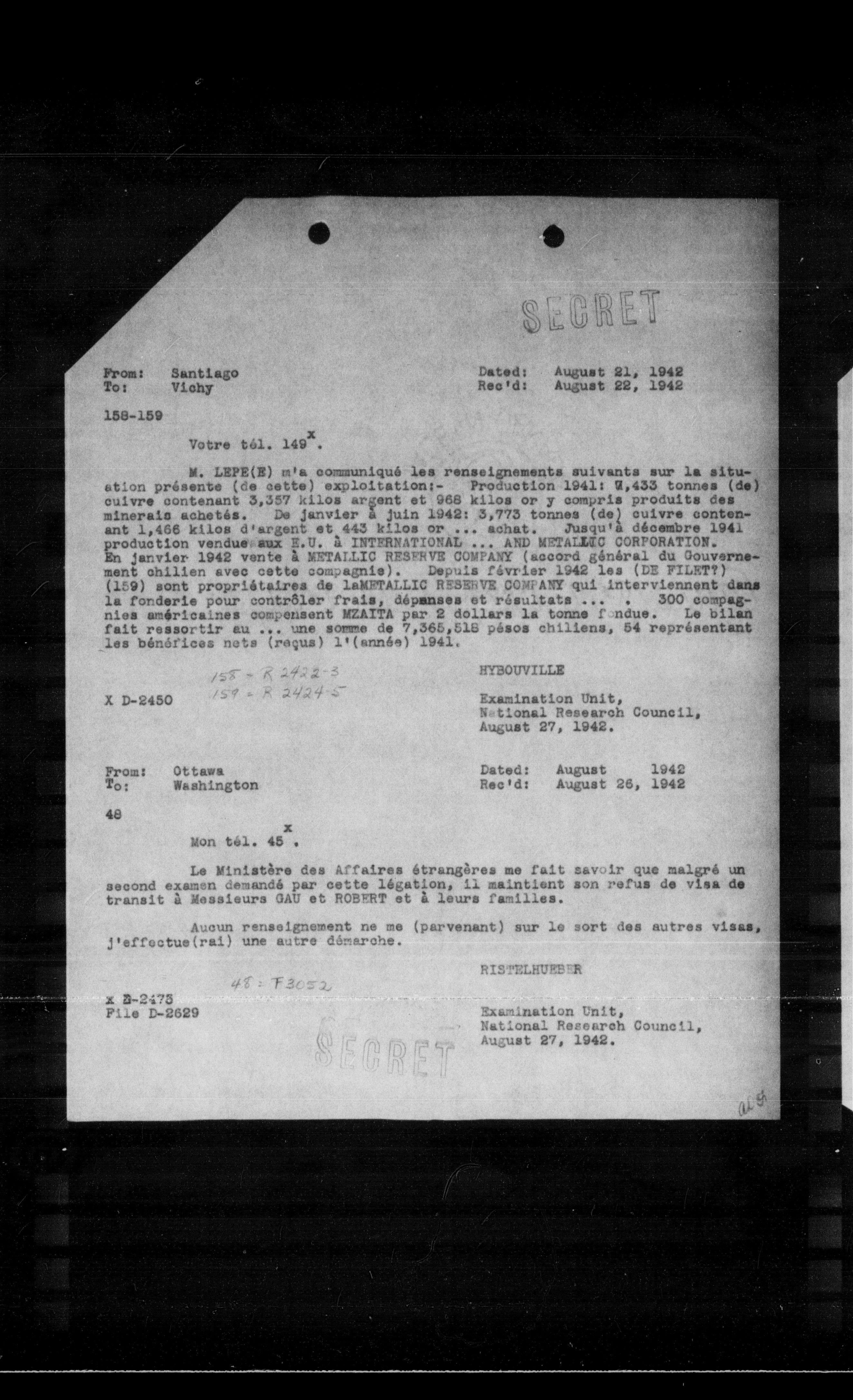 M. LEPE(E) m'a communiqué les renseignements suivants sur la situation présente (de cette) exploitation:- Production 1941: 9,433 tonnes (de) cuivre contenant 3,357 kilos argent et 968 kilos or y compris produits des minerais achetés. De janvier a juin 1942: 3,773 tonnes (de) cuivre contenant 1,466 kilos d'argent et 443 kilos or ... achat. Jusqu'à décembre 1941 production vendue: 222 E.G. à INTERNATIONAL ... AND METALLEC CORPORATION. En janvier 1942 vente a METALLIC RESERVE COMPANY (ascord général du Gouvernement chilien avec cette compagnie). Depuis février 1942 les (DE FILETY) (159) sont propriétaires de laMETALLIC RESERVE COMPANY qui interviennent dans la fonderie pour contrôler frais, dépenses et résultats ... . 300 compagaies américaines compensent MEAITA par 2 dollars la tonne f indue. Le bilan fait ressortir eu ... une somme de 7,365,010 pásos chiliens, 54 représentant les bénéfices nets (reģus) 1'(ann6e) 1941.