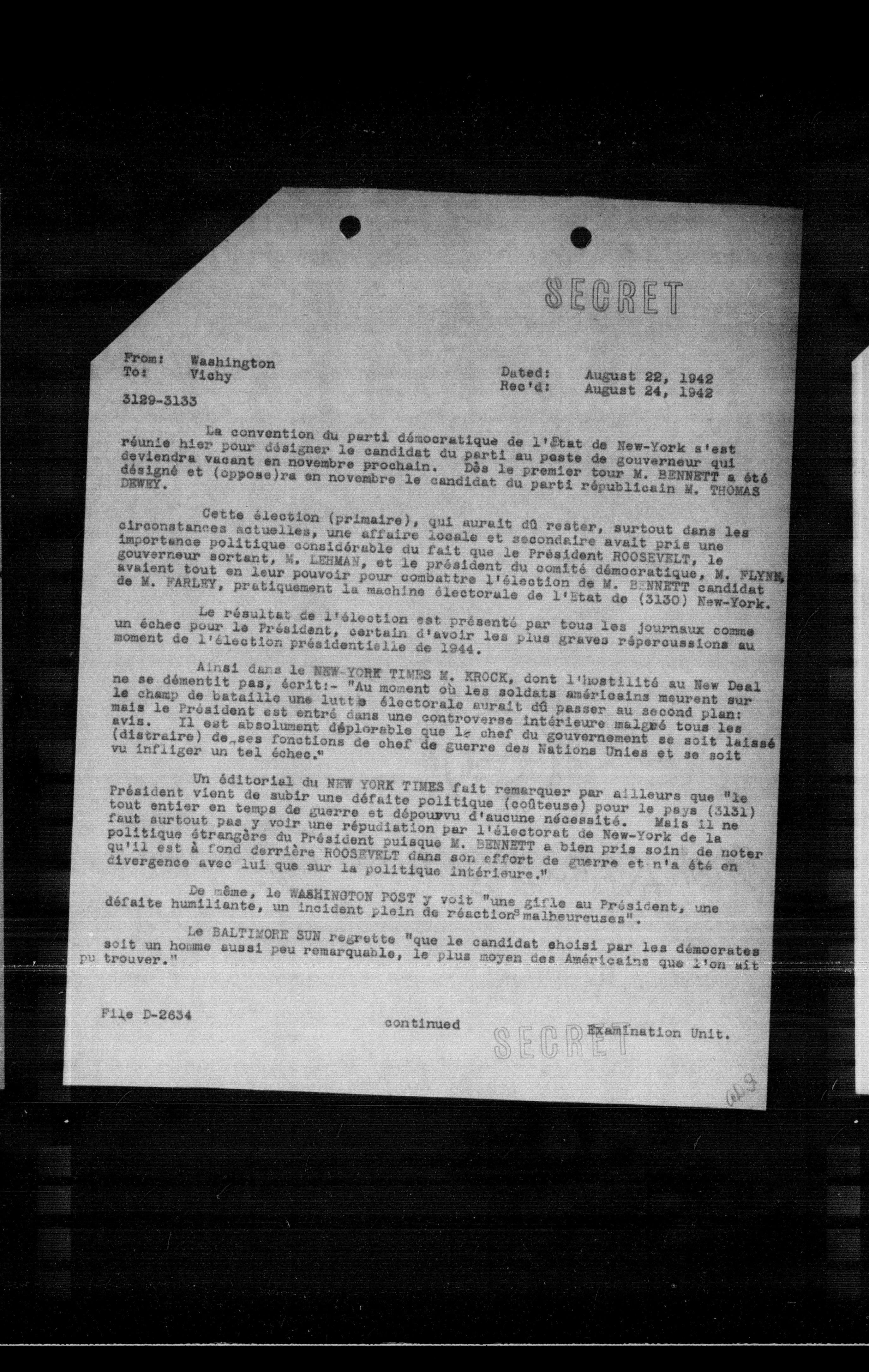 Cette élection (primaire), qui aurait dû rester, surtout dans les circonstances actuelles, une affaire locale et secondaire avait pris une importance politique considérable du fait que le Président ROOSEVELT, le gouverneur sortant, M. LERMAN, et le président du comité démocratique, M. FLYER avaient tout en leur pouvoir pour combattre l'élection de M. BENNETT candidat de M. FARLEY, pratiquement la machine électorale de l'État de (3130) New-York.