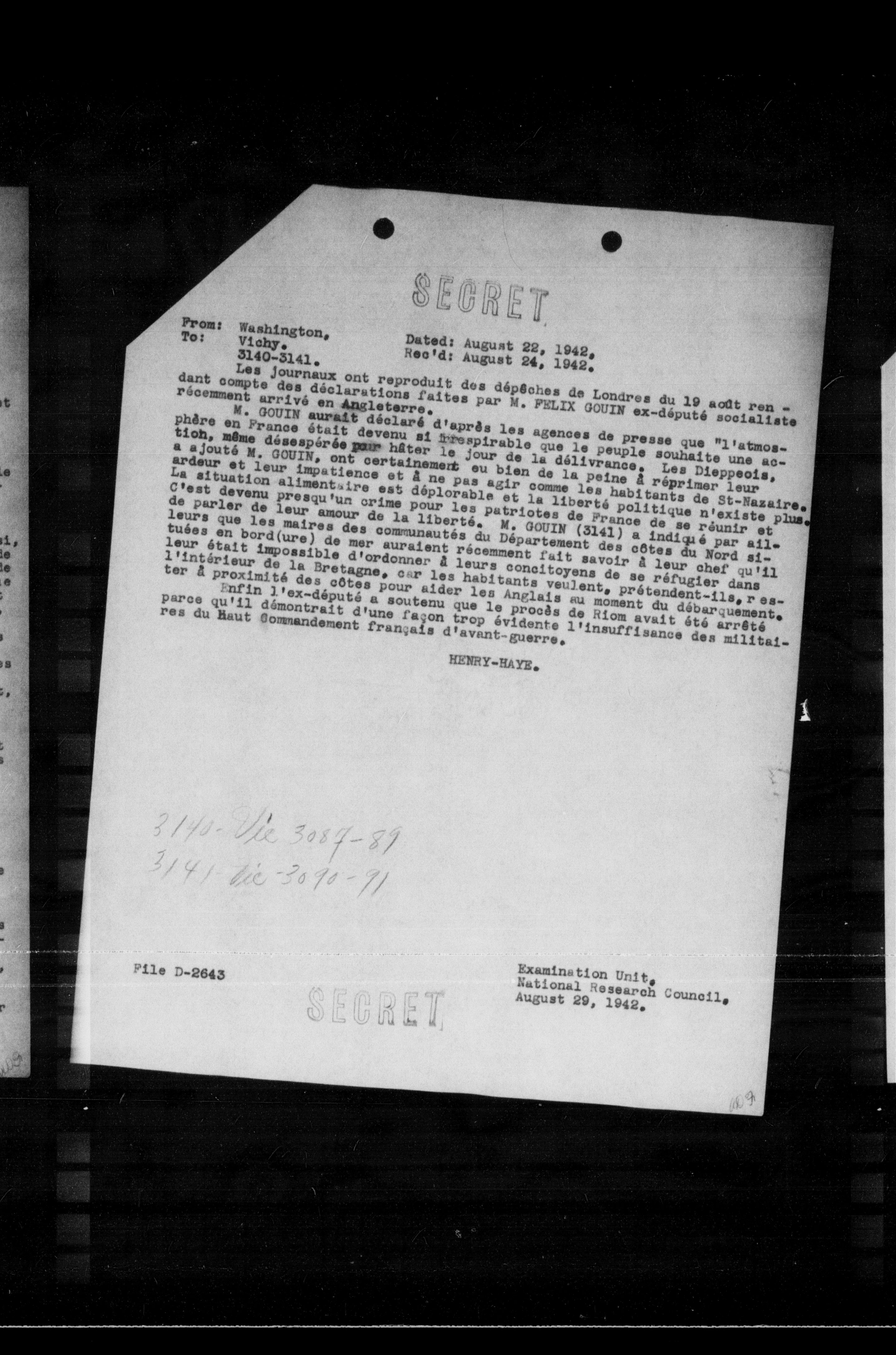 M. GOUIN aurait déclaré d'après les agences de presse que "l'atmosphère en France était devenu si irrespirable que le peuple souhaite une action, même désespérée pour hâter le jour de la délivrance. Les Dieppeois, a ajouté M. GOUIN, ont certainement eu bien de la peine à réprimer leur ardeur et leur impatience et à ne pas agir comme les habitants de St-Rasaire. La situation alimentaire est déplorable et la liberté politique n'existe plus. C'est devenu presque un crime pour les patriotes de France de se réunir et de parler de leur amour de la liberté. M. GOUIN (3141) a indiqué par ailleurs que les maires des communautés du Département des côtes du Nord situées en bord (ure) de mer auraient récemment fait savoir à leur chef qu'il leur était impossible d'ordonner à leurs concitoyens de se réfugier dans l'intérieur de la Bretagne, car les habitants veulent, prétendent-ils, rester à proximité des côtes pour aider les Anglais au moment du débarquement. Enfin, l'ex-député a soutenu que le procès de Riom avait été arrêté parce qu'il démontrait d'une façon trop évidente l'insuffisance des militaires du Haut Commandement français d'avant-guerre.