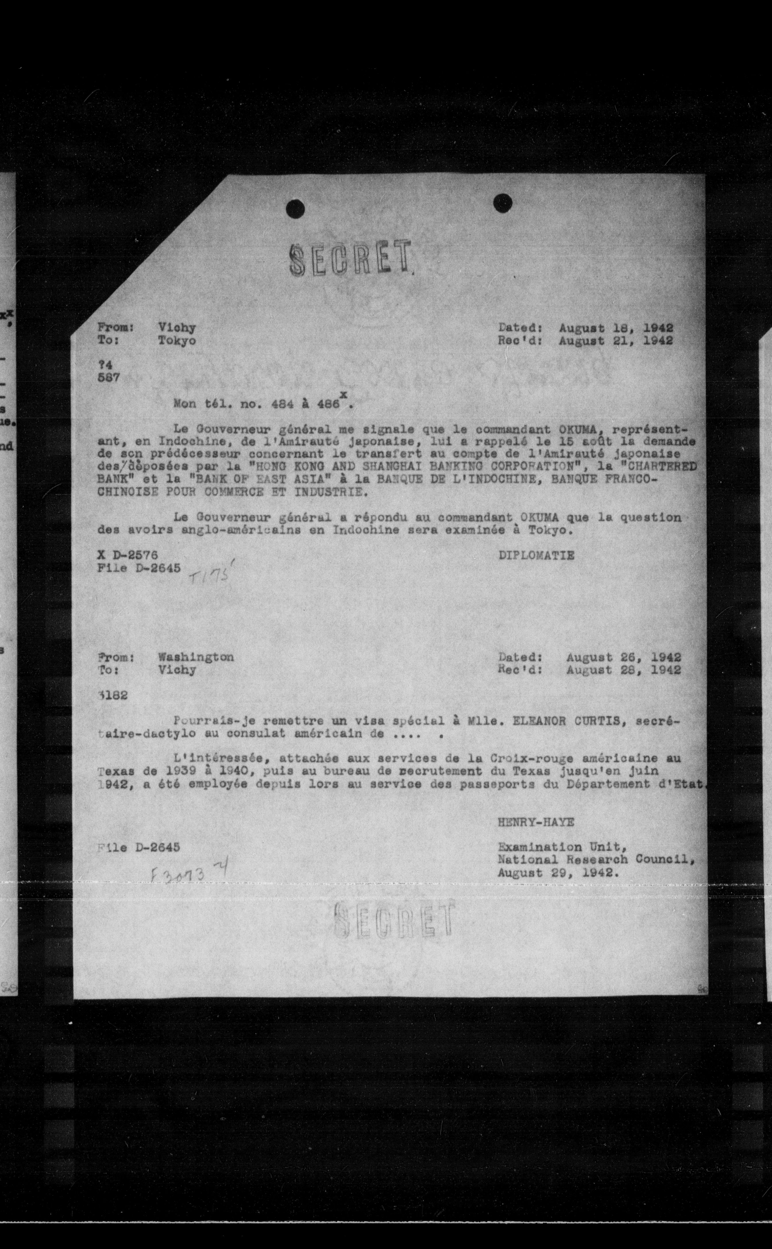 **From:** Vichy **To:** Tokyo **Date:** August 18, 1942 **Rec'd:** August 21, 1942