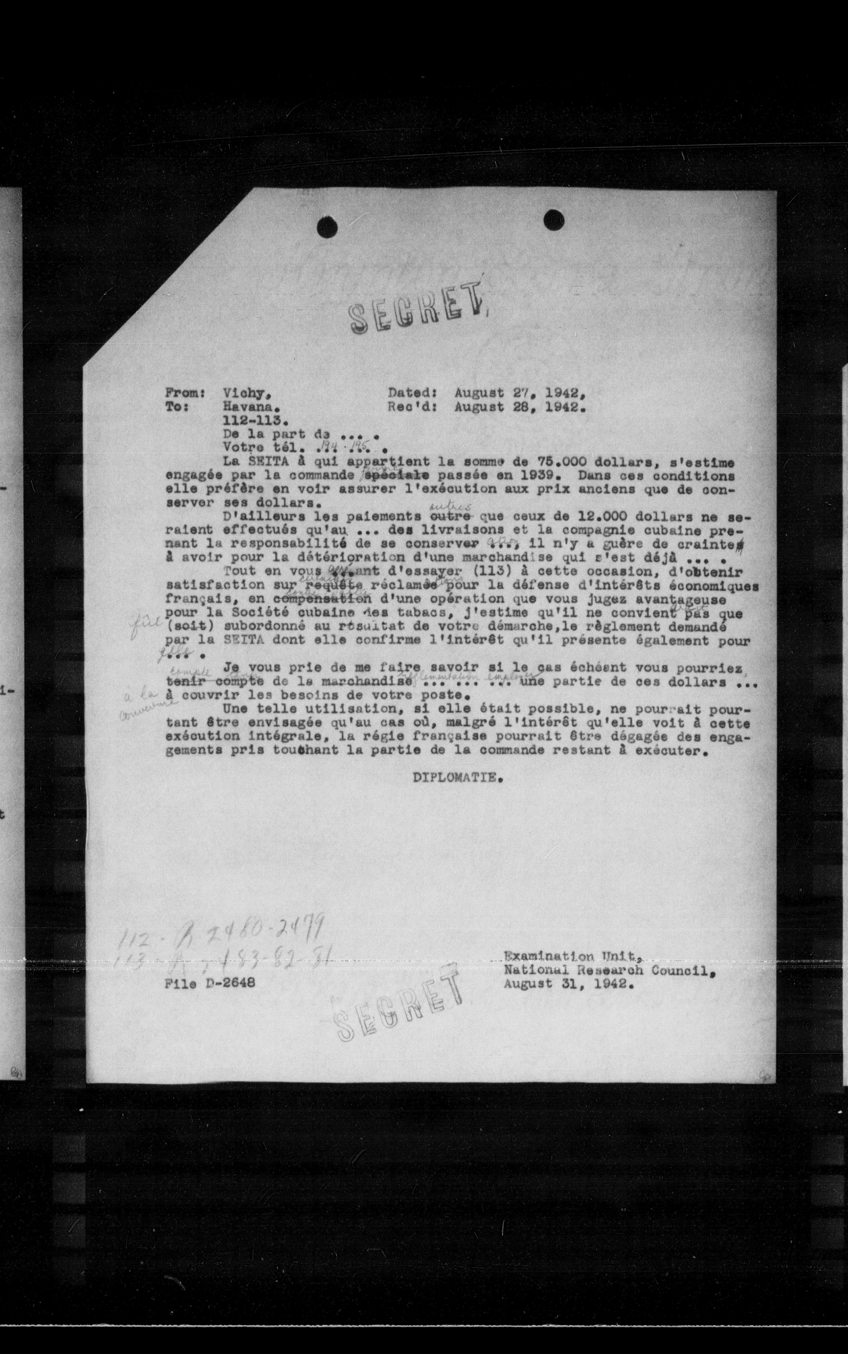 **From:** Vichy, **To:** Havana, **Date:** August 27, 1942, **Rec'd:** August 28, 1942, **Date:** 112-113