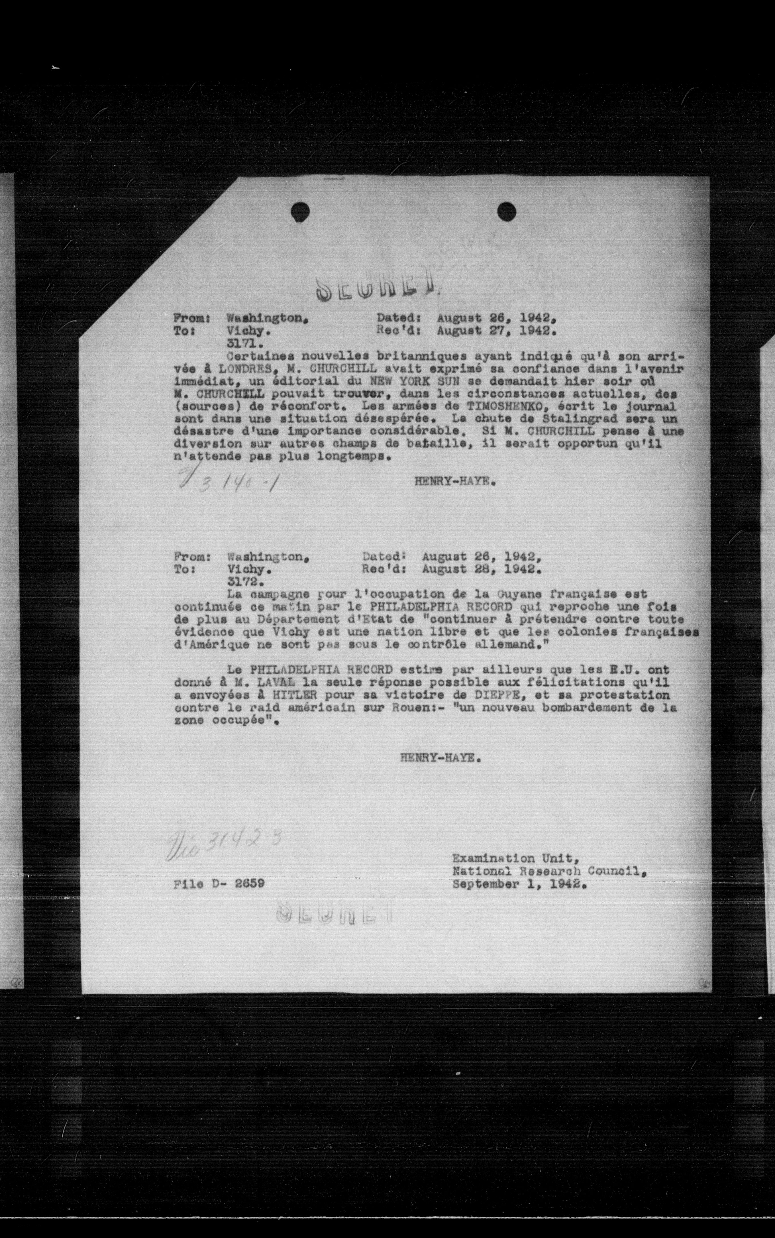 **From:** Washington, To: Vichy. 3171. **Date:** August 26, 1942. **Rec'd:** August 27, 1942.