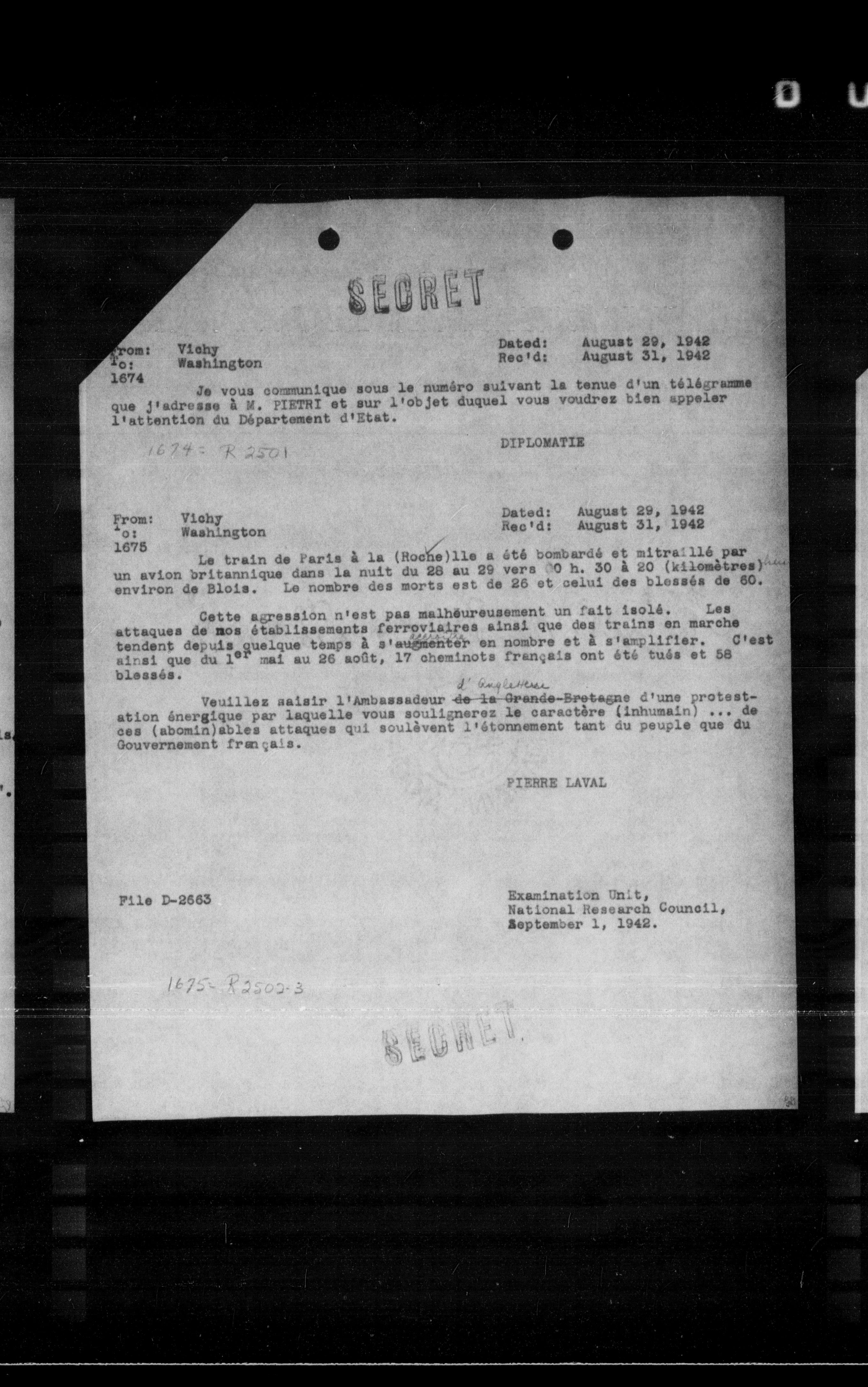 Le train de Paris à la (Hoche)lle a été bombardé et mitraillé par un avion britannique dans la nuit du 28 au 29 vers 00 h. 30 à 20 (kilomètres) environ de Blois. Le nombre des morts est de 26 et celui des blessés de 60.