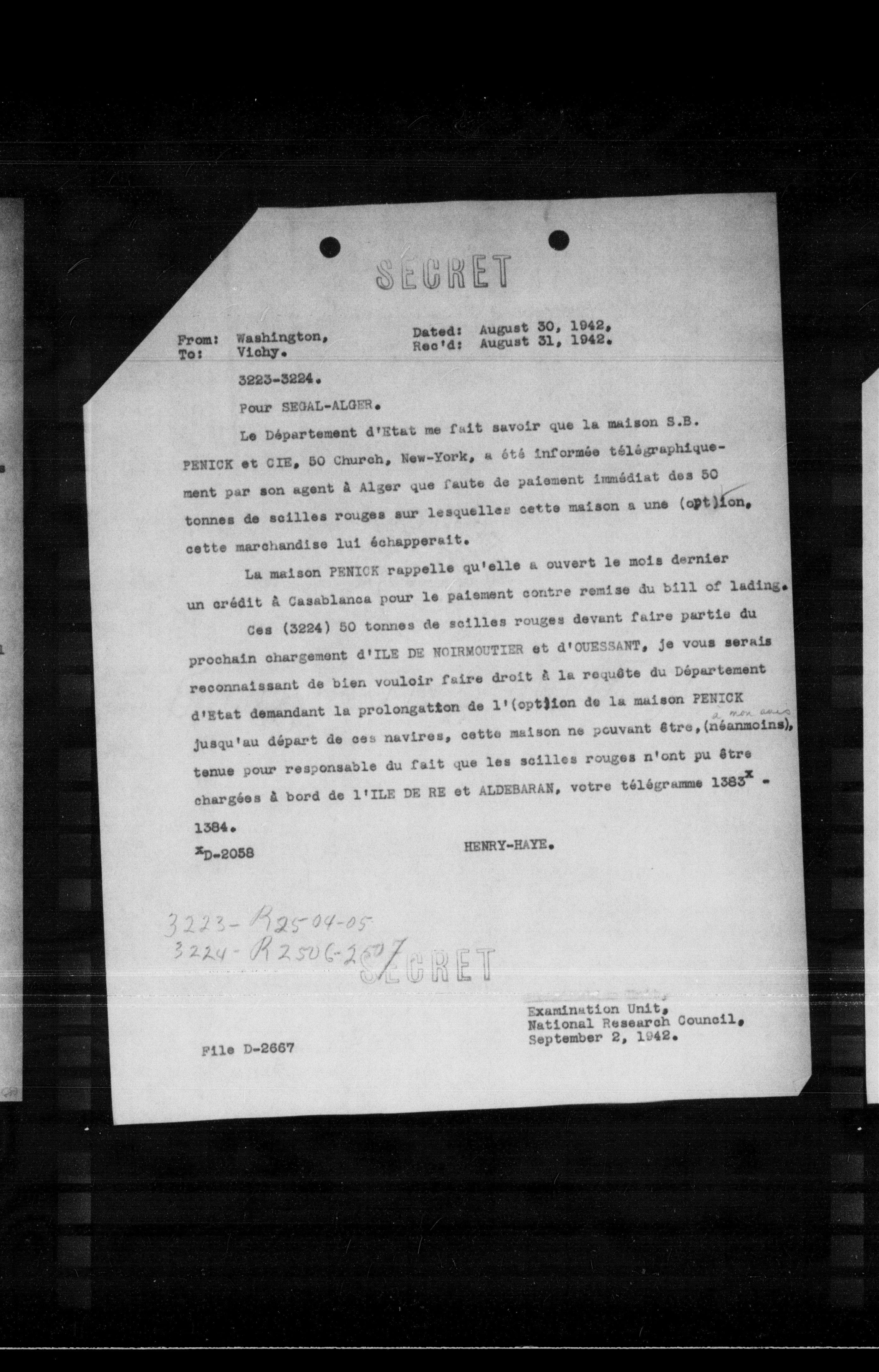 Ces (3224) 50 tonnes de scilles rouges devant faire partie du prochain chargement d'ILE DE NOIRMOUTIER et d'OUESSANT, je vous serais reconnaissant de bien vouloir faire droit a la requête du Département d'Etat demandant la prolongation de l'(opt)ion de la maison PENICK jusqu'au départ de ces navires, cette maison ne pouvant être, (néanmoins), tenue pour responsable du fait que les scilles rouges n'ont pu être chargées \& bord de l'ILE DE RE et ALDEBARAN, votre télégramme $1383^{\circ}$ 1384.