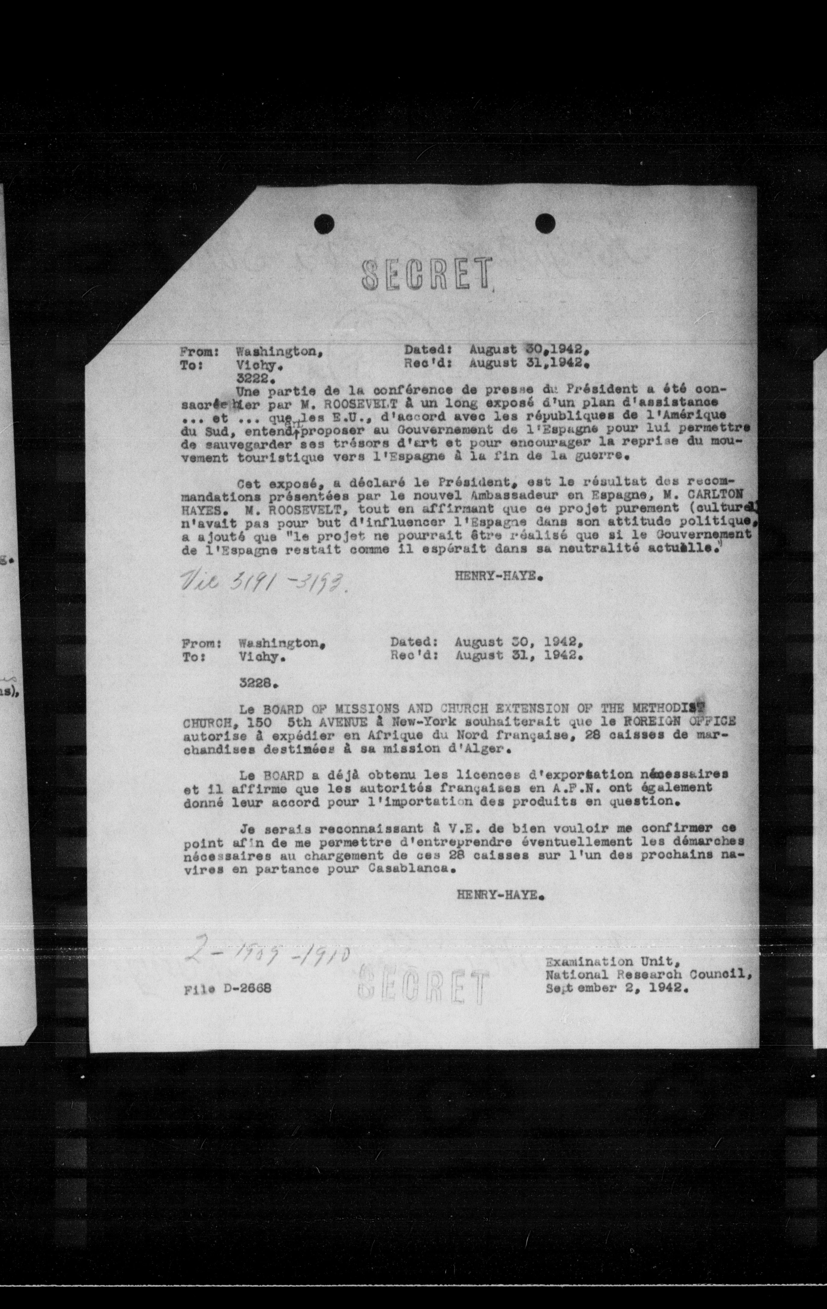 **From:** Washington, **To:** Vichy, **Date:** August 30, 1942, **Rec'd:** August 31, 1942, **3228.**