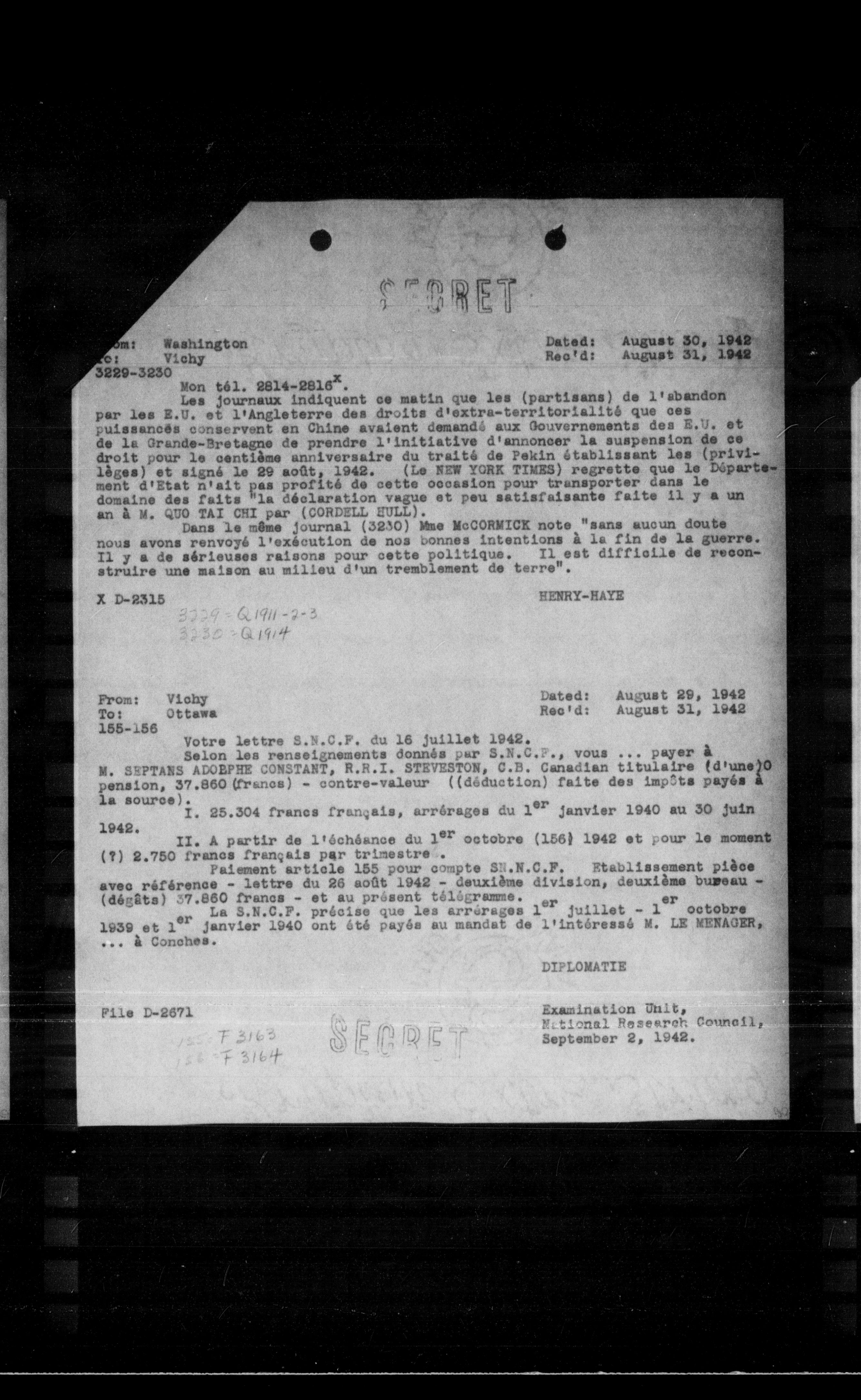 M. SEPTARE ADOEPHE CONSTANT, R.R.I. STEVESTON, C.B. Canadian titulaire (d'une) 0 pension, 37.860 (France) - contre-valeur ((déduction) faite des impôts payés à la source).