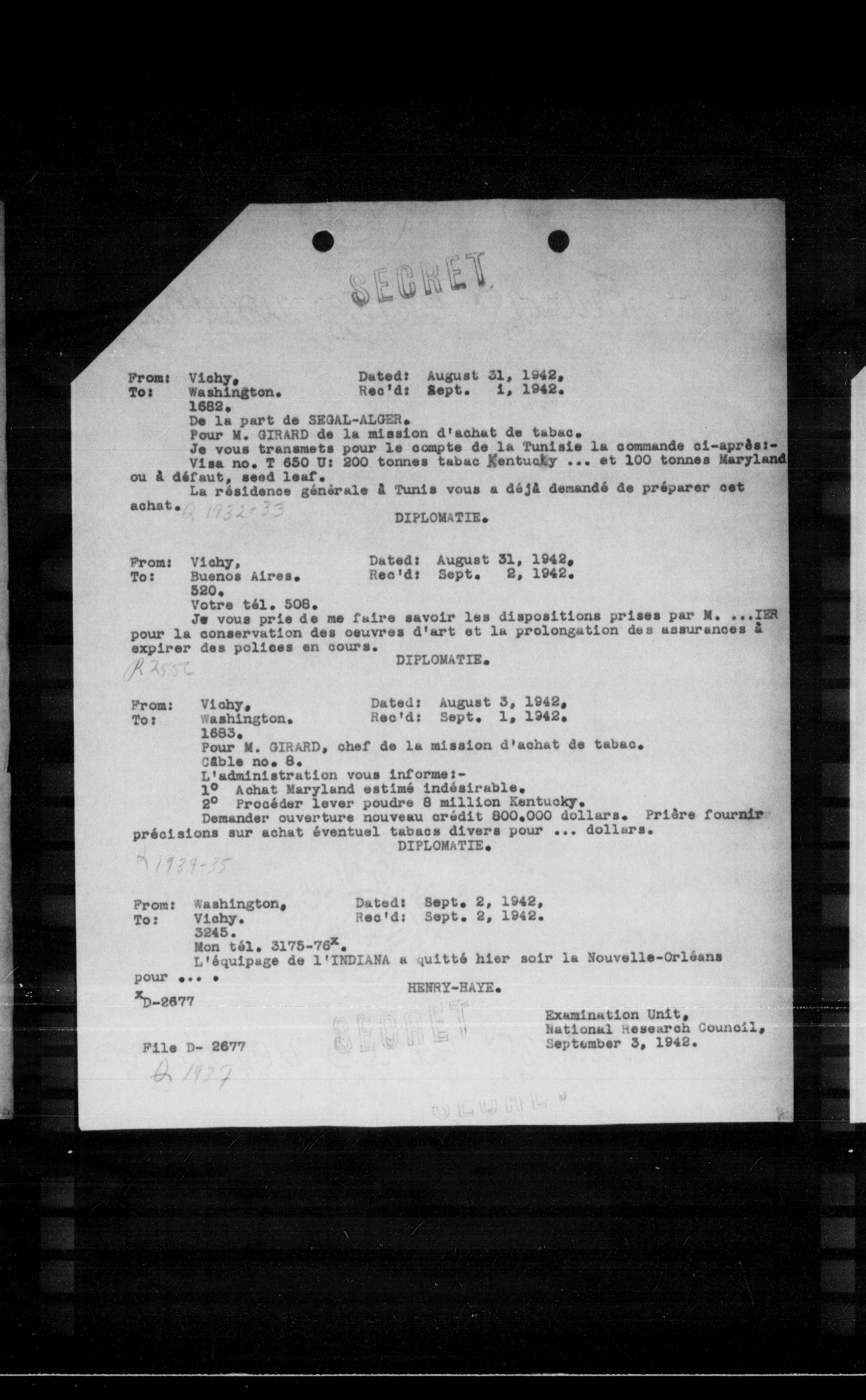 **From:** Washington, **To:** Vichy, **Date:** Sept. 2, 1942.