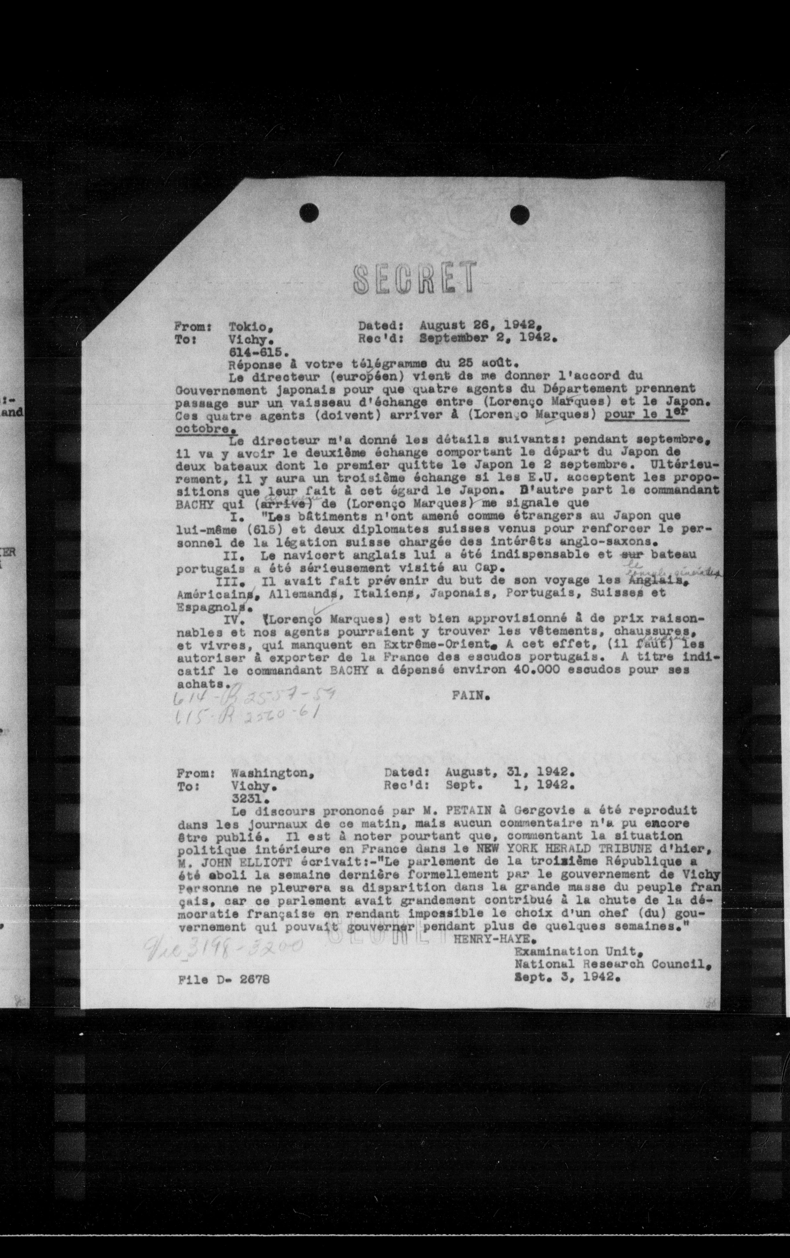 **From:** Tokio, **To:** Vichy, **Date:** August 26, 1942, **Rec'd:** September 2, 1942, **Reponse à votre télégramme du 25 août.**