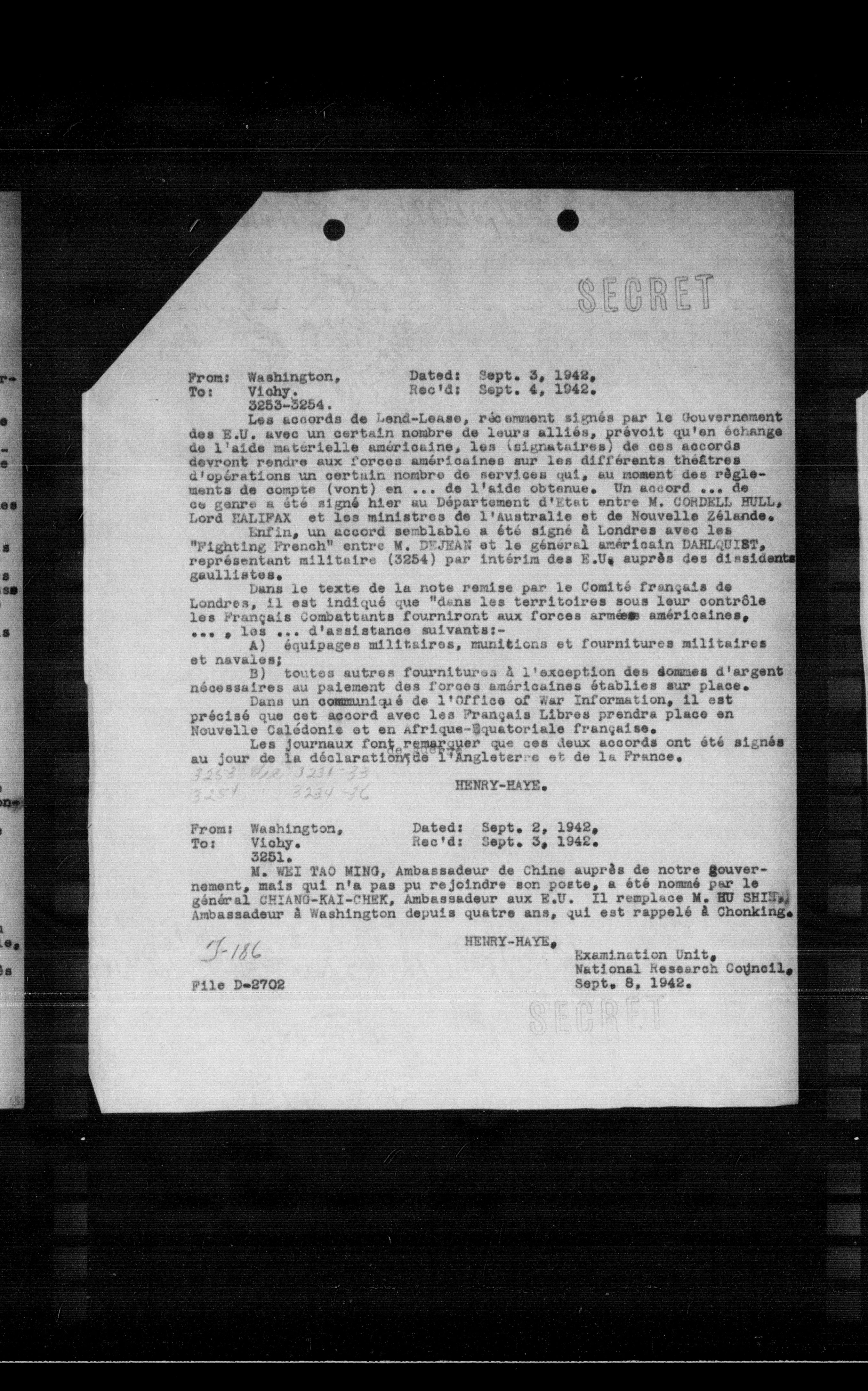 **From:** Washington, **To:** Vichy, **Date:** Sept. 2, 1942, **Rec'd:** Sept. 3, 1942.