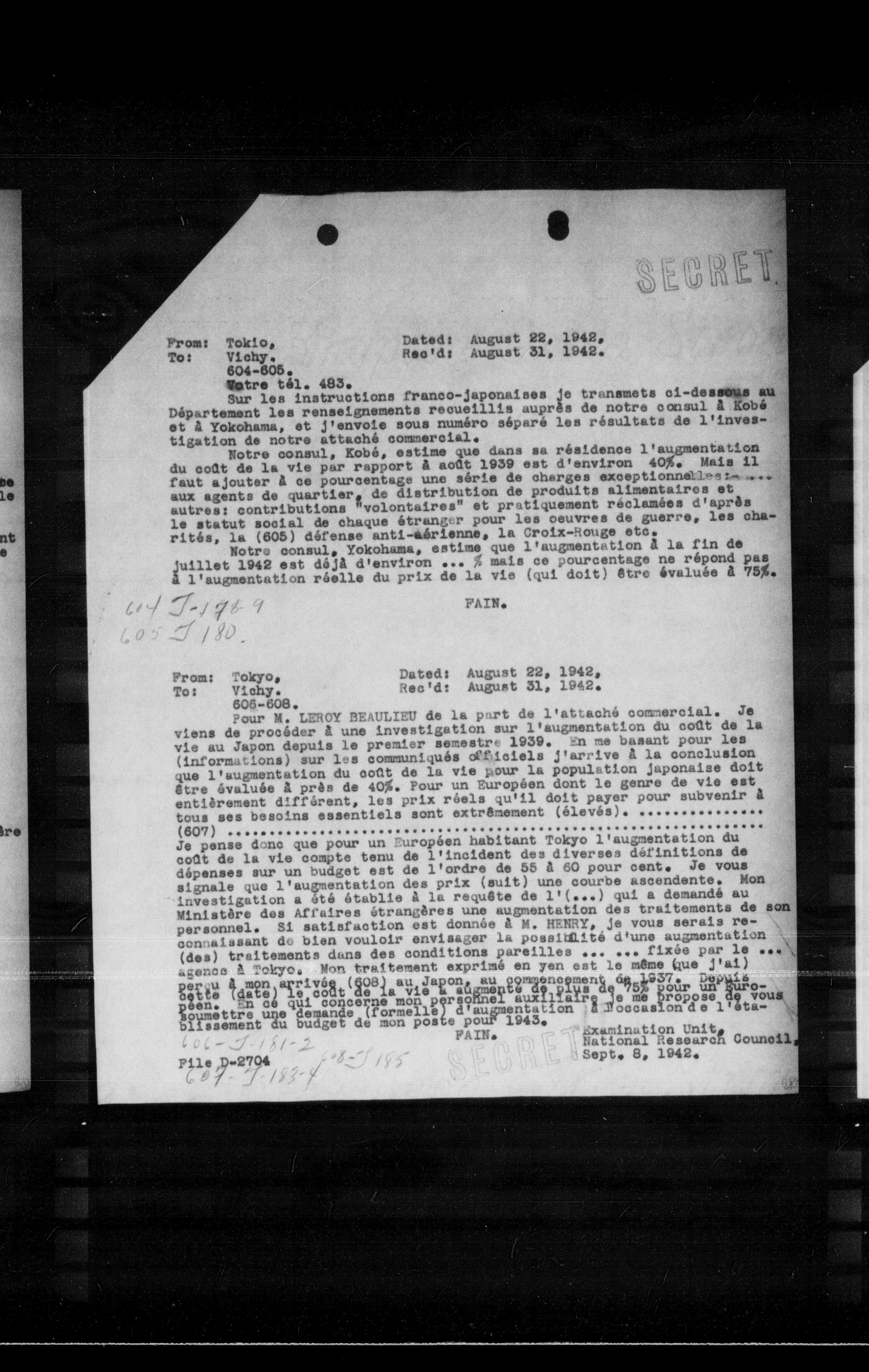 **From:** Ticko, **To:** Vichy, **Date:** August 22, 1942, **Rec'd:** August 31, 1942, **Date:** 604-605, **Date:** 483