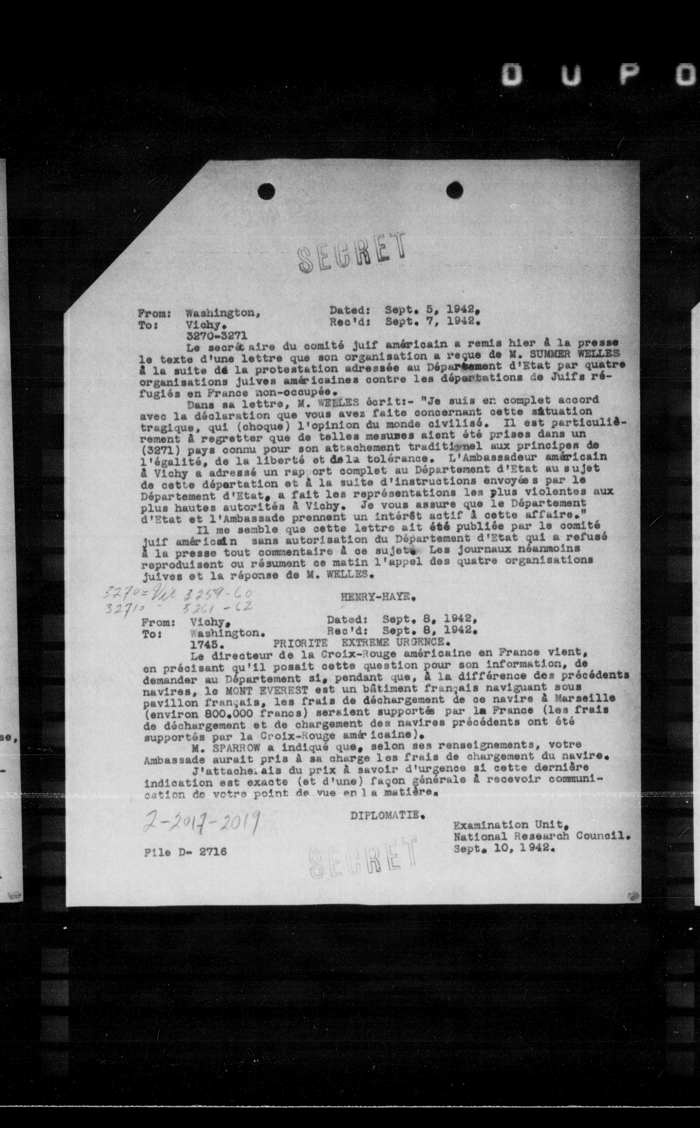 Dans sa lettre, M. WEELES écrit:- "Je suis en complet accord avec la déclaration que vous avez faite concernant cette atuation tragique, qui (choque) l'opinion du monde civilisé. Il est particulie. rement a regretter que de telles mesures aient été prises dans un (3271) pays connu pour son attachement traditional aux principes de l'égalité, de la liberté et de la tolérance. L'Ambassadeur américain a Vichy a adressé un rap ort complet au Département d'Etat au sujet de cette départation et a la suite d'instructions envoyés par le Département d'Etat, a fait les représentations les plus violentes aux plus hautes autorités a Vichy. Je vous assure que le Département d'Etat et l'Ambassade prennent un intérêt actif a cette affaire."