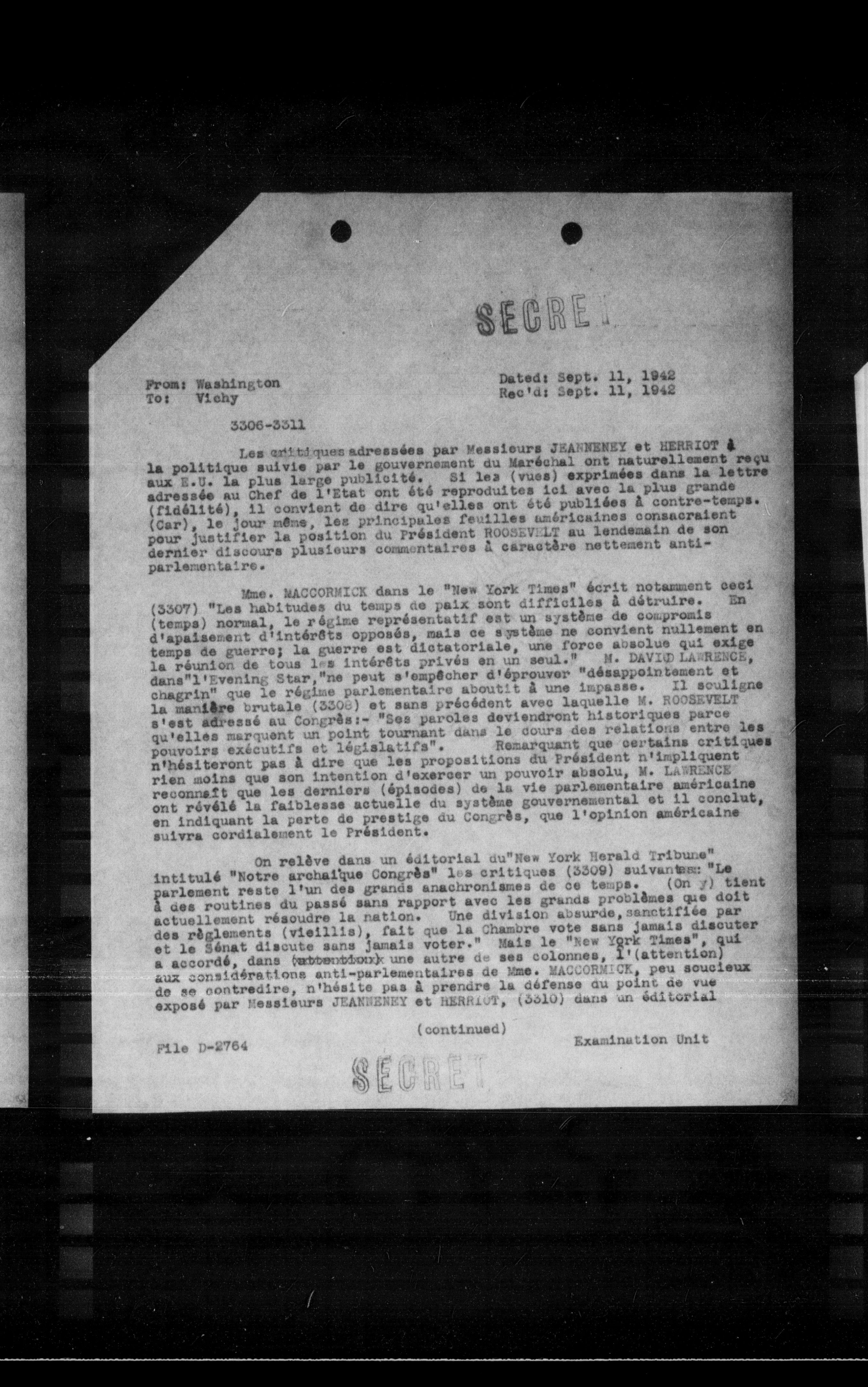 Les critiques adressées par Messieurs JEANNENEY et HERRIOT à la politique suivie par le gouvernement du Maréchal ont naturellement reçu aux S.O. la plus large publicité. Si les (vues) exprimées dans la lettre adressée au Chef de l'Etat ont été reproduites ici avec la plus grande (fidélité), il convient de dire qu'elles ont été publiées à contre-temps. (Car), le jour même, les principales feuilles américaines consacraient pour justifier la position du Président ROOSEVELT au lendemain de son dernier discours plusieurs commentaires à caractère nettement anti-parlementaire.