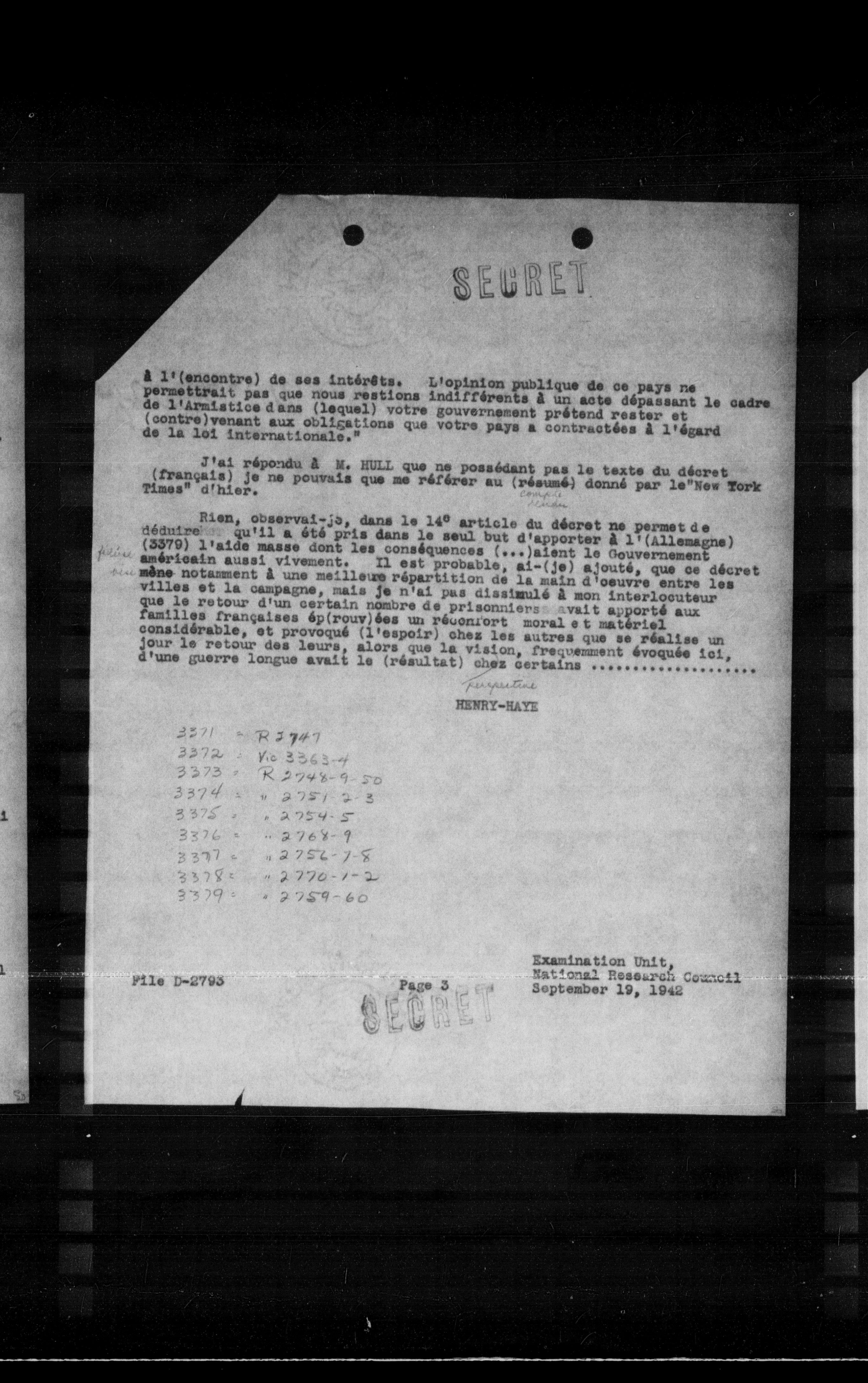 Rien, observai-je, dans le 14<sup>e</sup> article du décret ne permet de déduire qu'il a été pris dans le seul but d'apporter à l' (allemand) (SS79) l'aide masse dont les conséquences (…) aient le Gouvernement américain aussi vivement. Il est probable, ai-je ajouté, que ce décret même notamment à une meilleure répartition de la main d'œuvre entre les villes et la campagne, mais je n'ai pas dissimulé à mon interlocuteur que le retour d'un certain nombre de prisonniers avait apporté aux familles françaises ép(rouv)ées un réconfort moral et matériel considérable, et provoqué (l'espoir) chez les autres que se réalise un jour le retour des leurs, alors que la vision, fréquemment évoquée ici, d'une guerre longue avait le (résultat) chez certains.