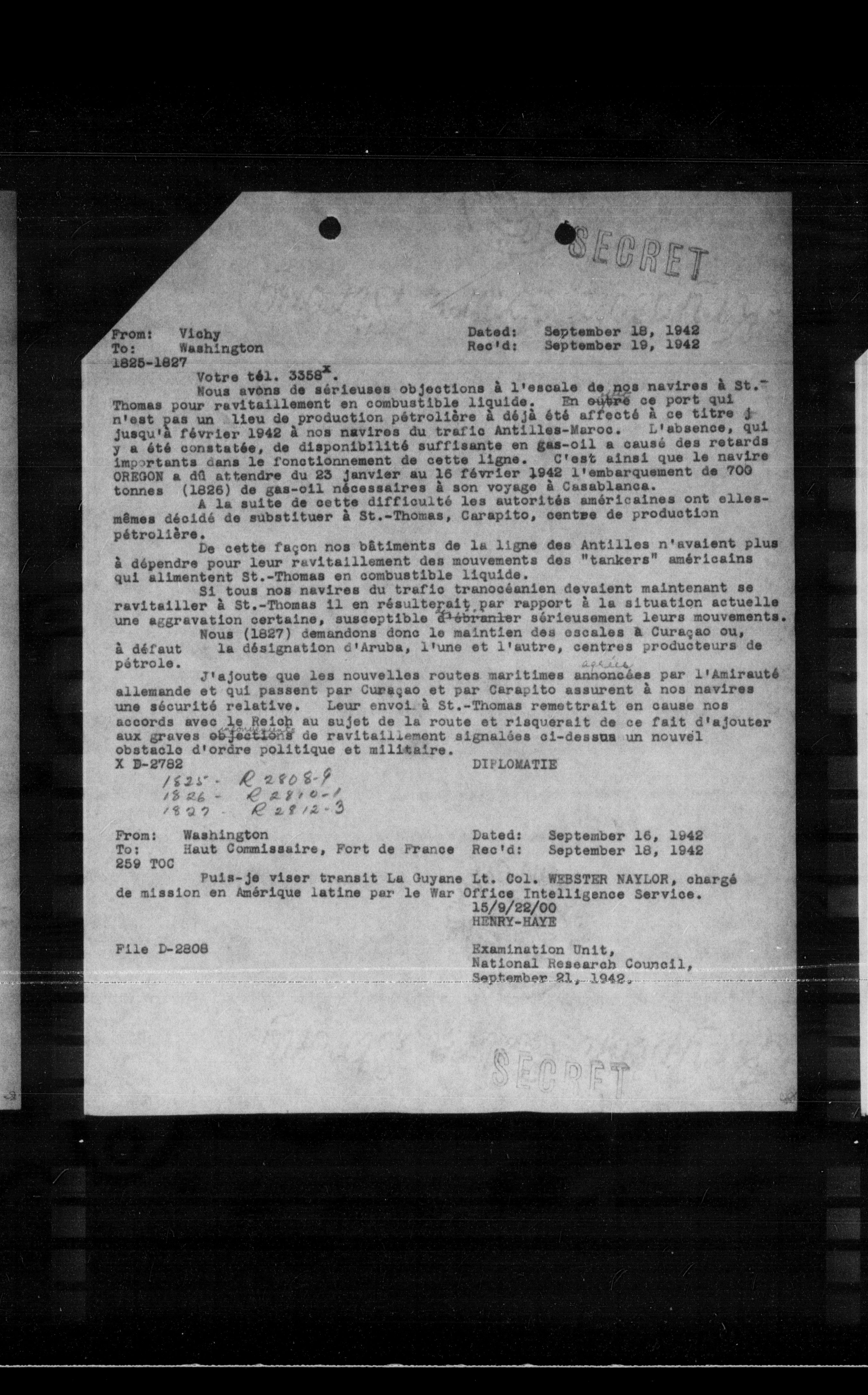 Puis-je viser transit La Guyane Lt. Col. WEBSTER NAYLOR, chargé de mission en Amérique latine par le War Office Intelligence Service. 15/9/22/00