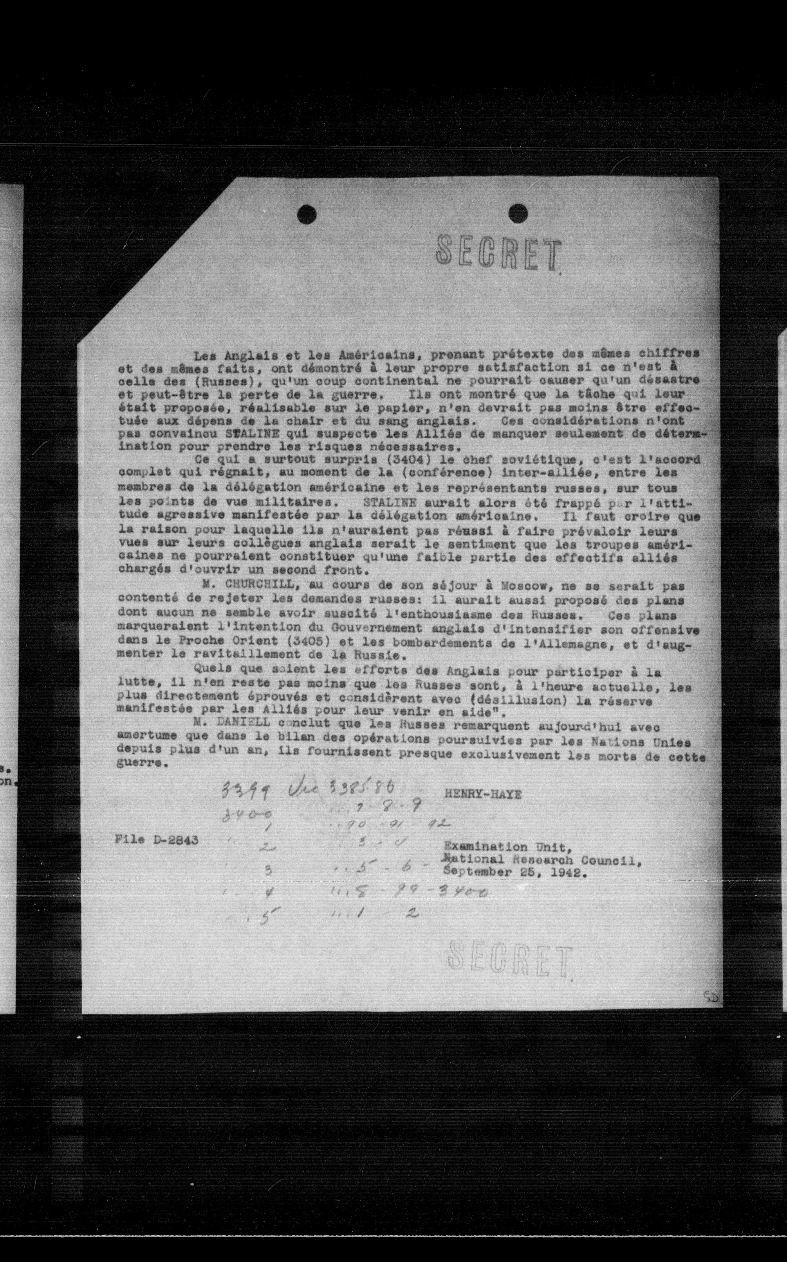 Ce qui a surtout surpris (3404) le chef soviétique, c'est l'accord complet qui régnait, au moment de la (conférence) inter-alliée, entre les membres de la délégation américaine et les représentants russes, sur tous les points de vue militaires. STALINE aurait alors été frappé par l'attitude agressive manifestée par la délégation américaine. Il faut croire que la raison pour laquelle ils n'auraient pas réussi à faire prévaloir leurs vues sur leurs collègues anglais serait le sentiment que les troupes américaines ne pourraient constituer qu'une faible partie des effectifs alliés chargés d'ouvrir un second front.