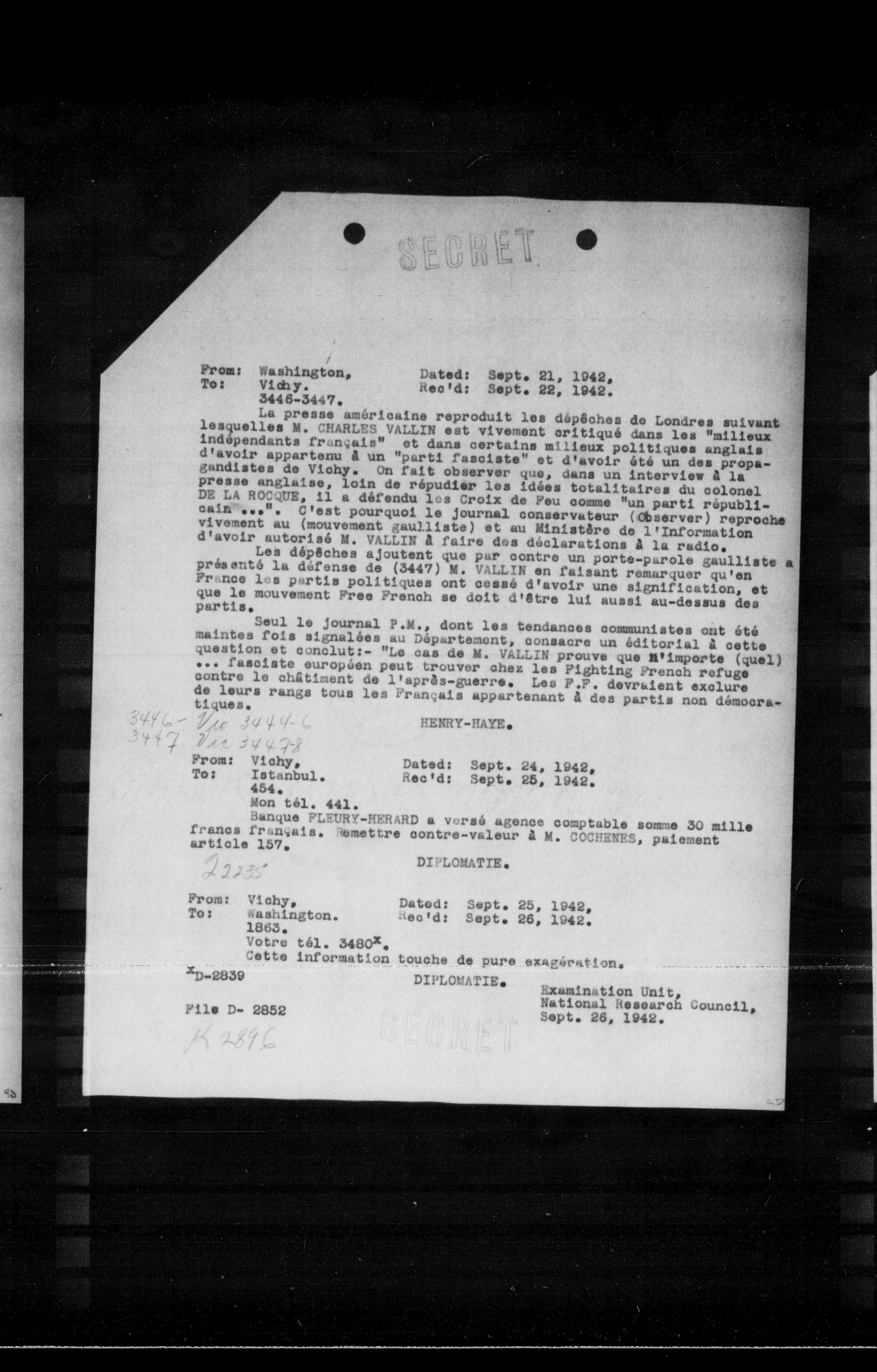 3-D-2839 DIPLOMATIE. Examination Unit, National Research Council, Sept. 26, 1942.