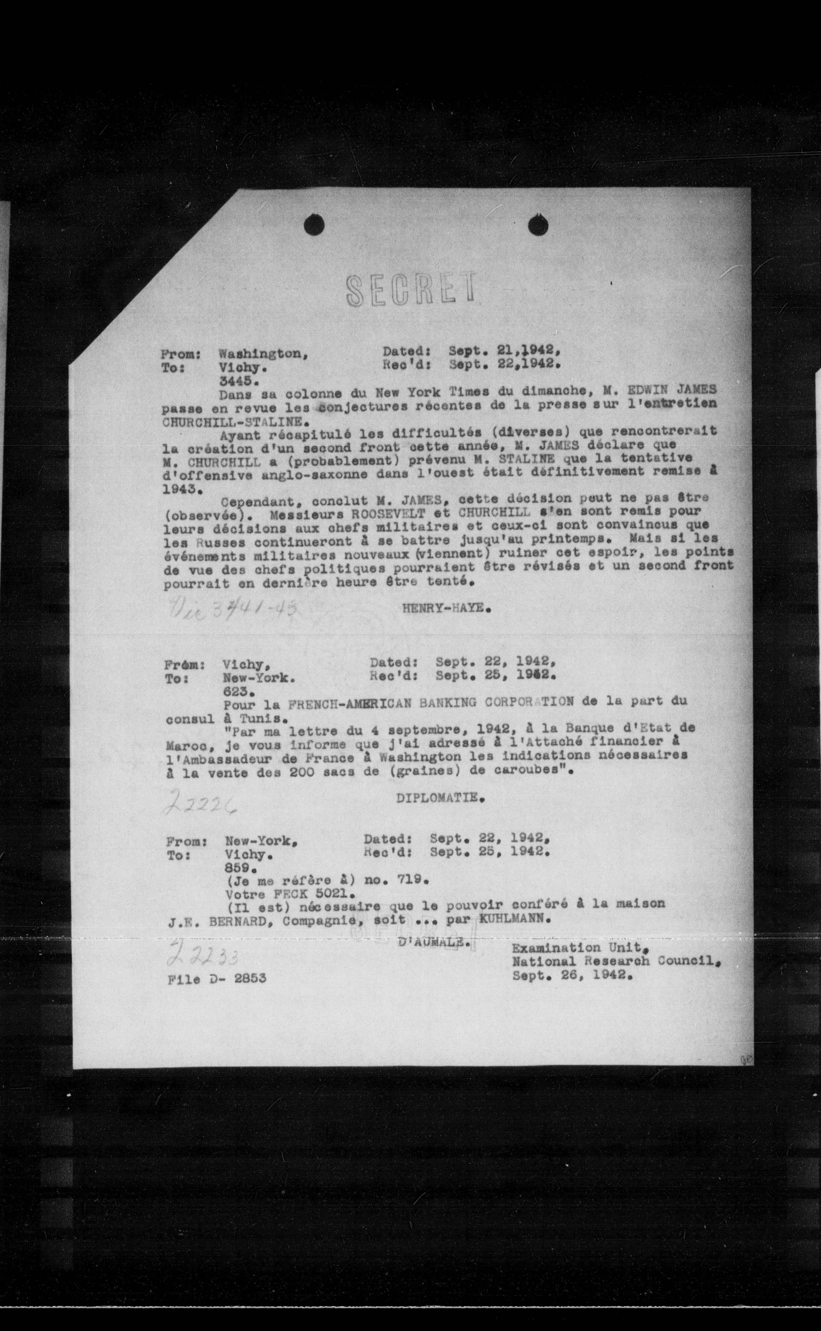 To: Vichy. Rec'd: Sept. 25, 1942.