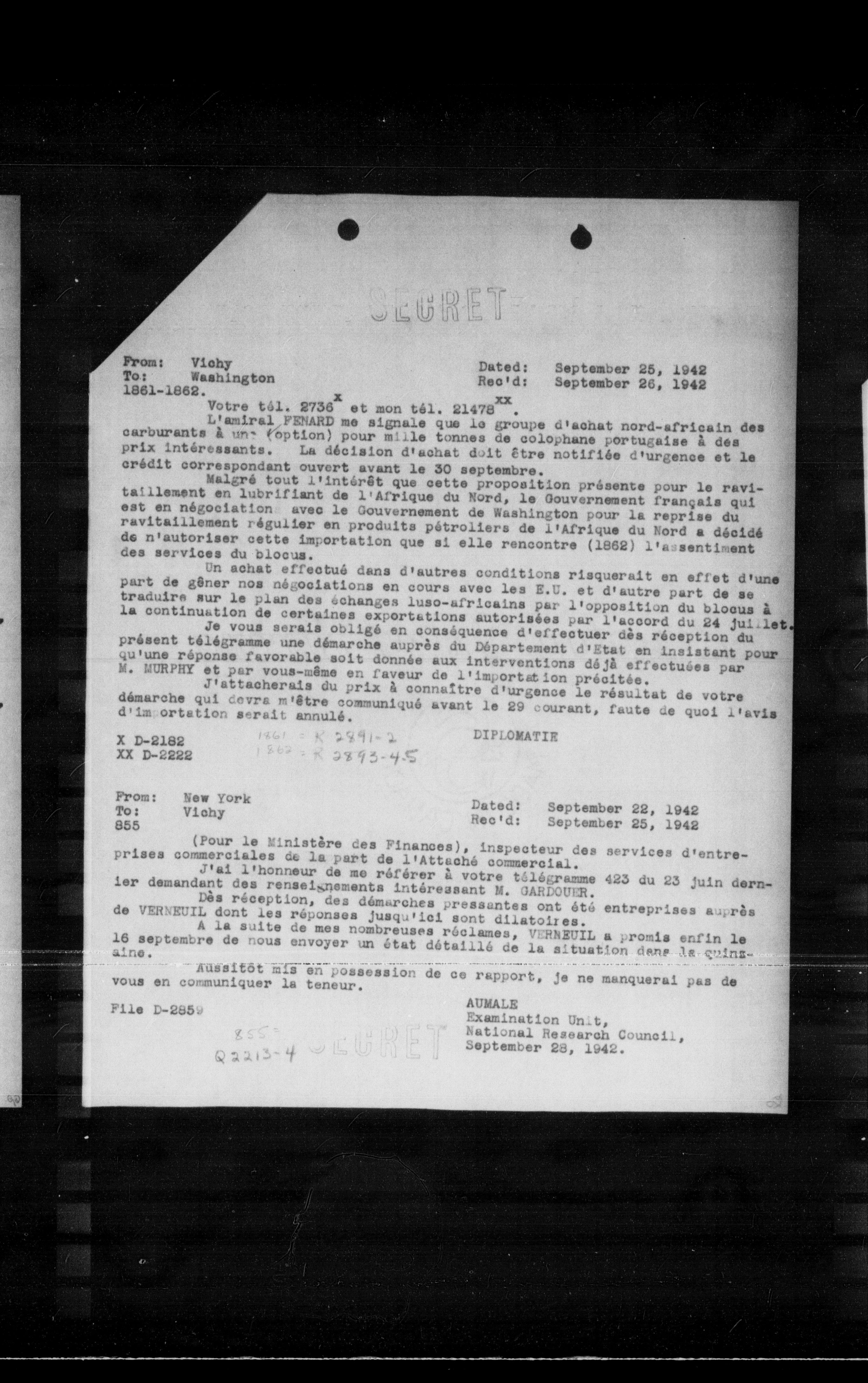 L'amiral FENARD me signale que le groupe d'achat nord-africain des carburants à une (option) pour mille tonnes de colophane portugaise à des prix intéressants. La décision d'achat doit être notifiée d'urgence et le crédit correspondant ouvert avant le 30 septembre.