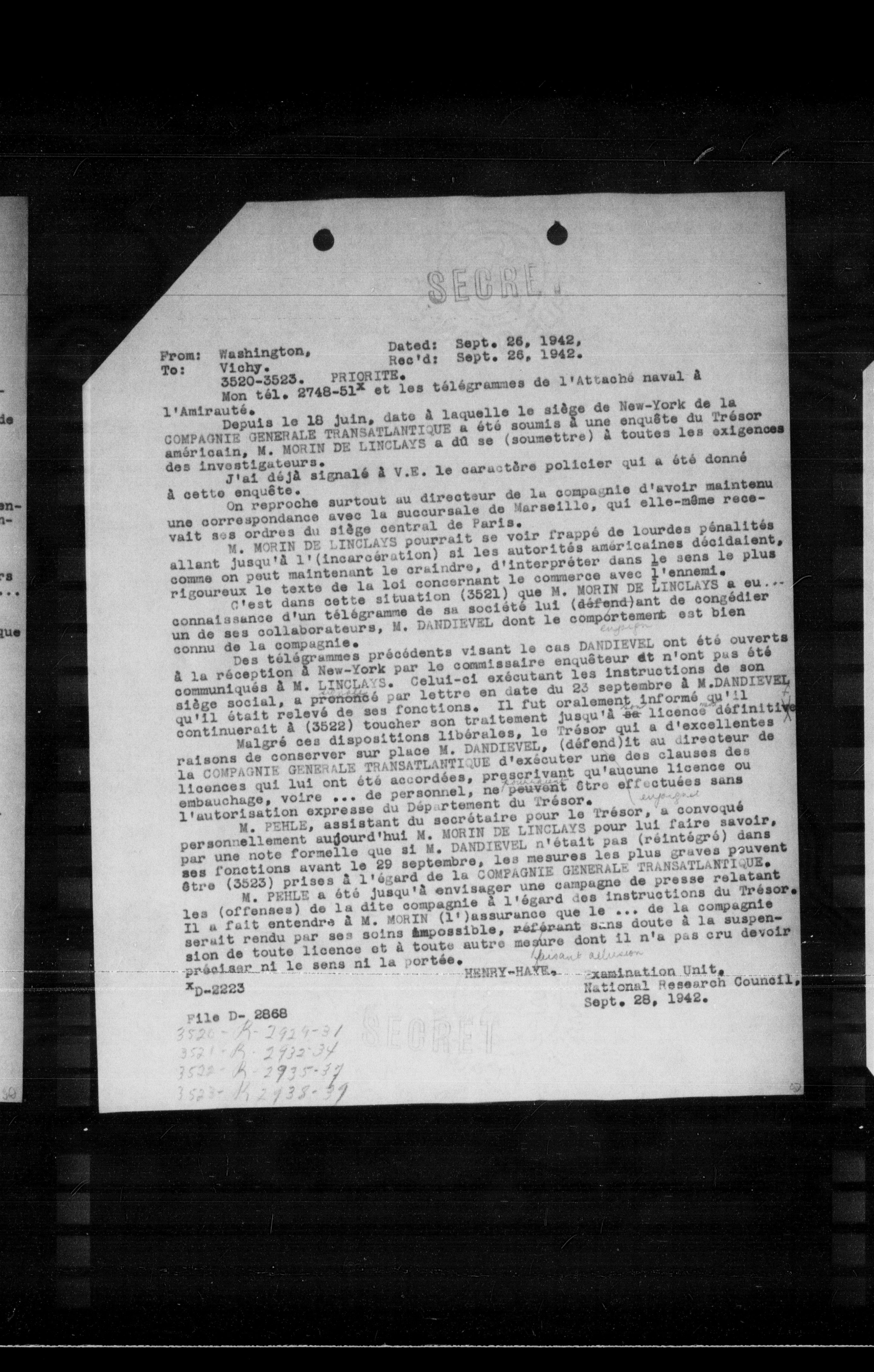 - From: Washington, Dated: Sept. 26, 1942, To: Vicky, Rec'd: Sept. 26, 1942. 3520-3523. PRIORITÉ. Mon tél. 2748-51 et les télégrammes de l'Attaché naval à l'Amirauté.