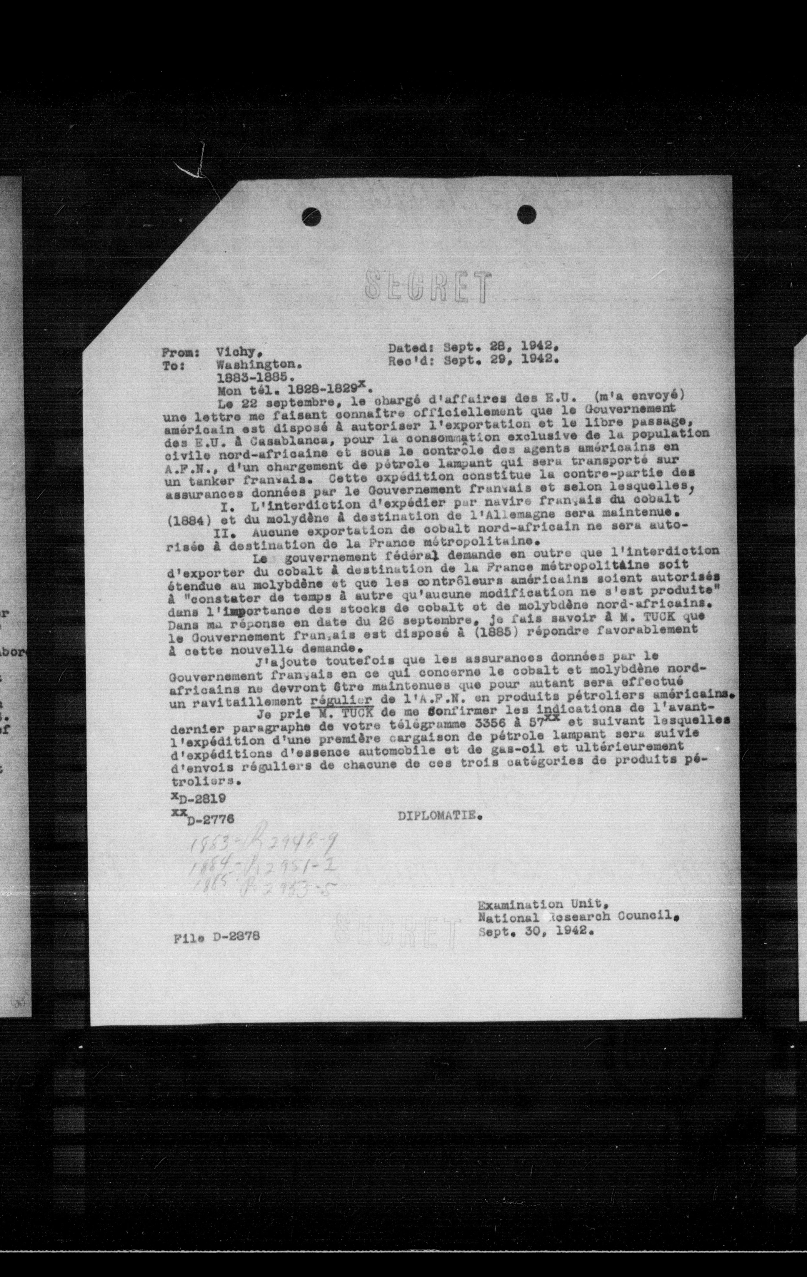 **From:** Vichy, **To:** Washington, **To:** Washington, 1883-1888. **Date:** Sept. 28, 1942. **Rec'd:** Sept. 29, 1942.