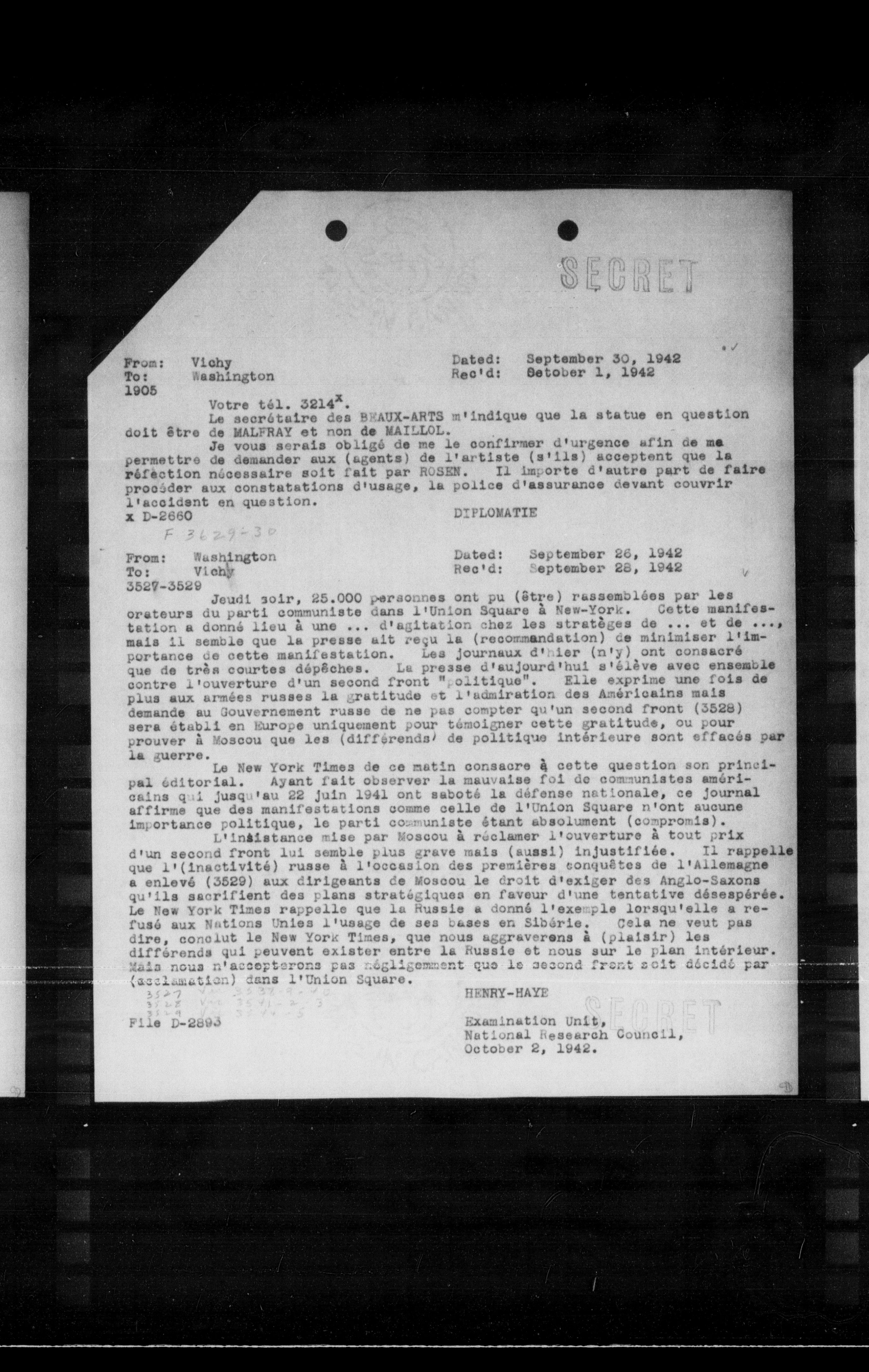 Jeudi soir, 25.000 personnes ont pu (être) rassemblées par les orateurs du parti communiste dans l'Union Square à New York. Cette manifestation a donné lieu à une d'agitation chez les stratégies de ... et de mais il semble que la presse ait reçu la (recommandation) de minimiser l'importance de cette manifestation. Les journaux d'ici ont consacré que de très courtes dépenses. La presse d'aujourd'hui s'élève avec ensemble contre l'ouverture d'un second front "politique". Elle exprime une fois de plus aux armées russes la gratitude et l'admiration des Américains mais demande au Gouvernement russe de ne pas compter qu'un second front (SS28) sera établi en Europe uniquement pour témoigner cette gratitude, ou pour prouver à Moscou que les (différends) de politique intérieure sont effacés par la guerre.