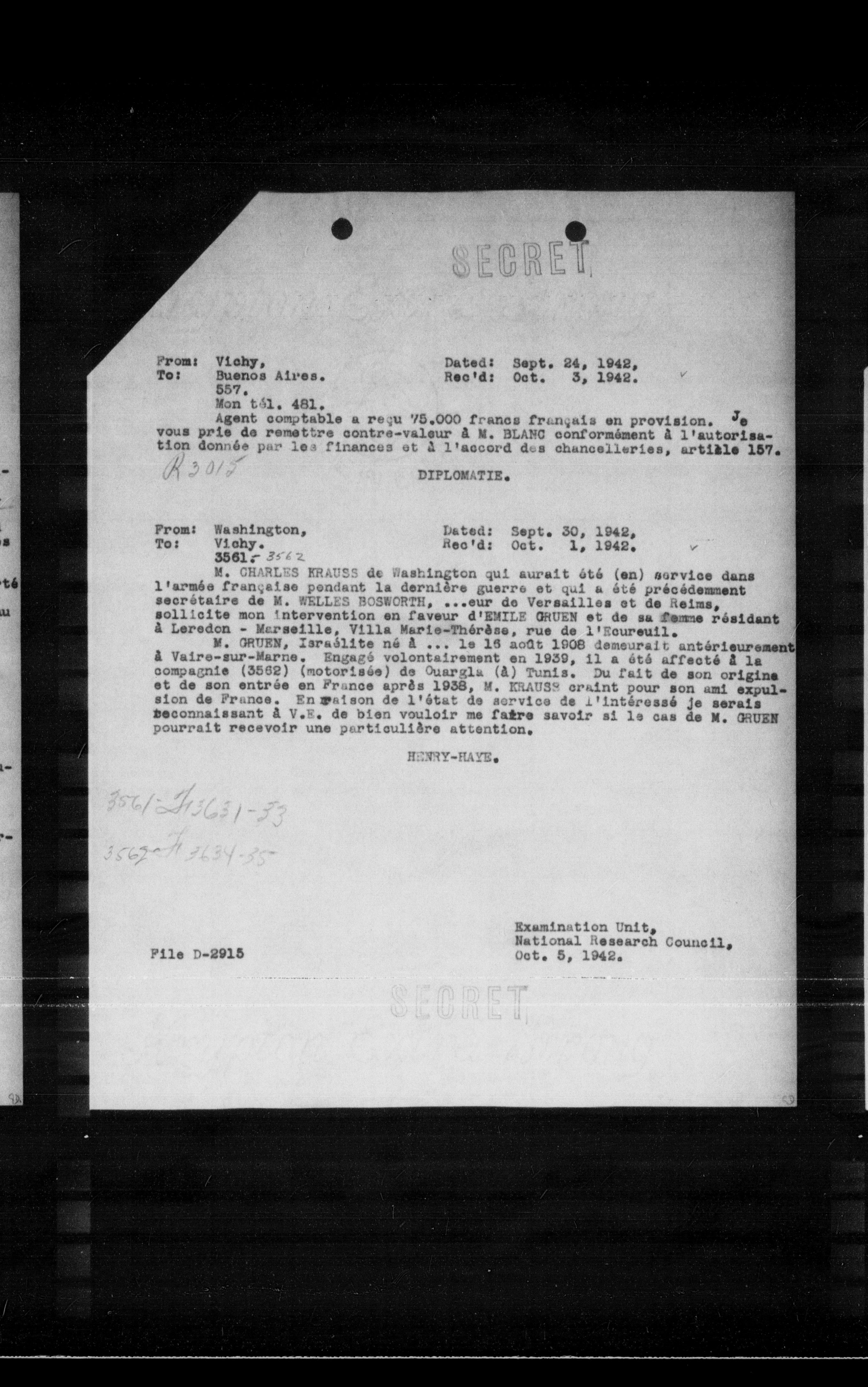 **M. CHARLES BRAUSS de Washington qui aurait été (en) service dans l'armée française pendant la dernière guerre et qui a été précédemment secrétaire de M. WELLES ROSECRTH, ... sur de Versailles et de Reims, sollicitée mon intervention en faveur d'EMILE GRUEN et de sa femme résidant à Laredon - Marseille, Villa Marie-Thérèse, rue de l'Ecureuil.**