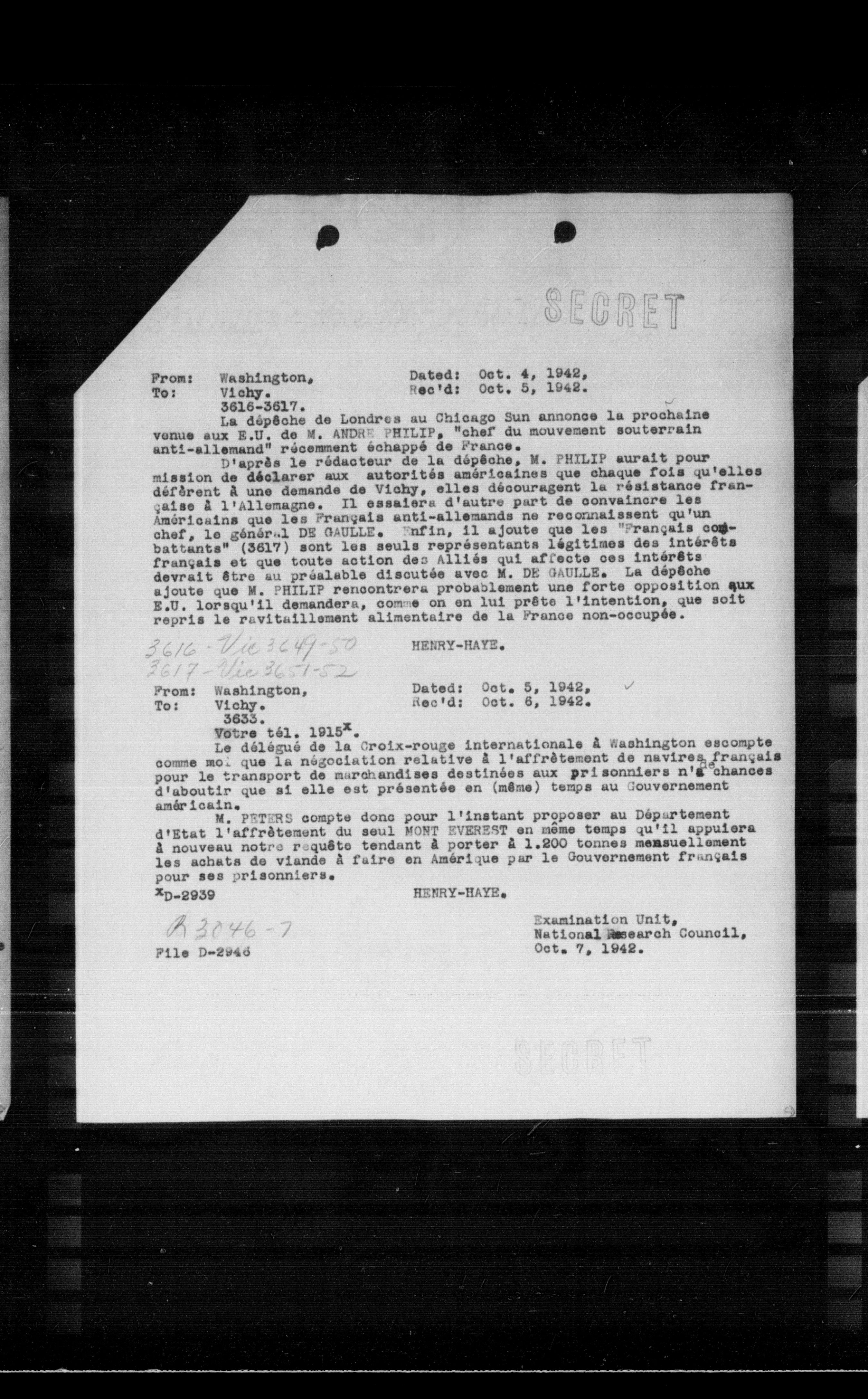 **From:** Washington, **To:** Vichy, **To:** 3633.