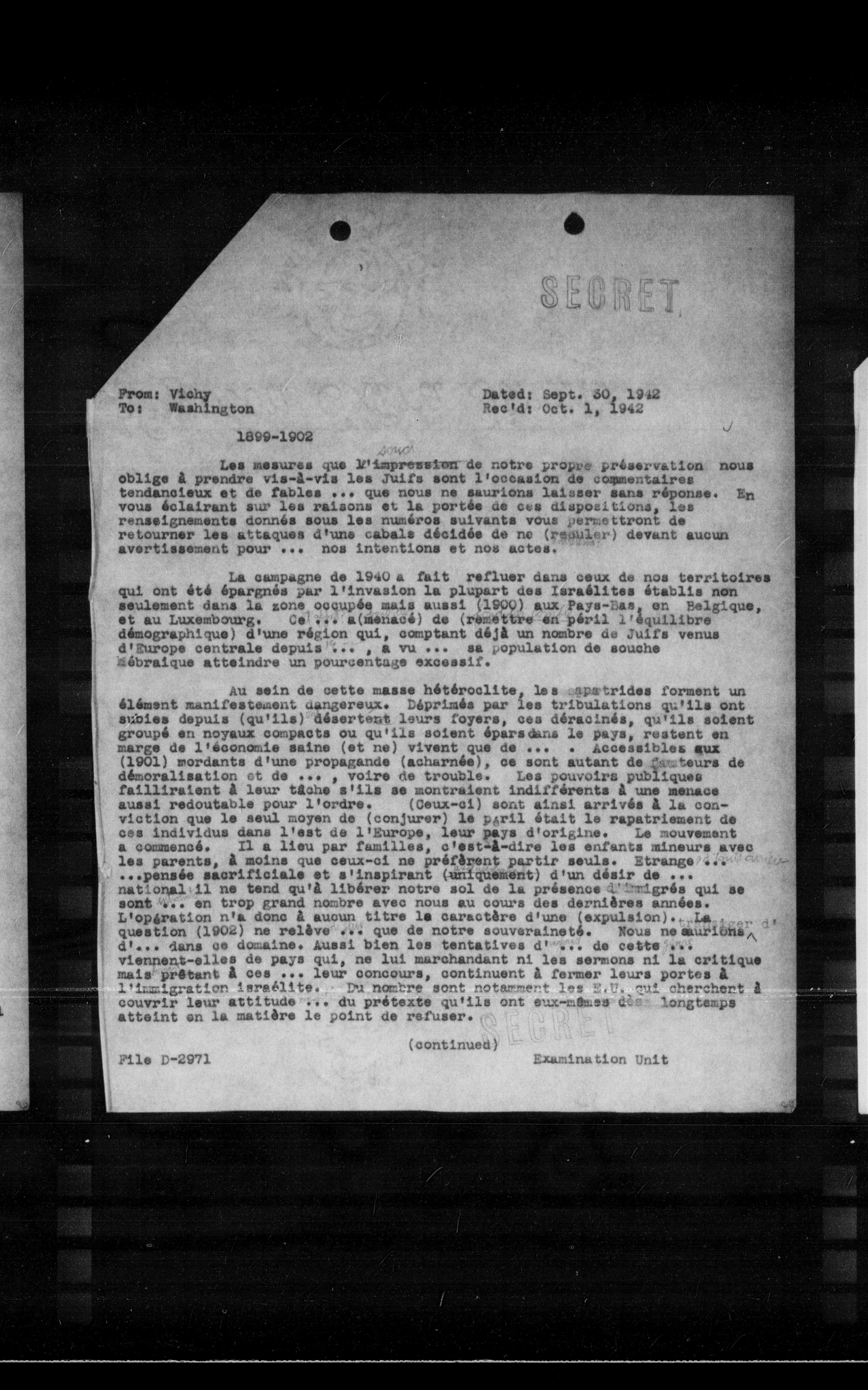 La campagne de 1940 a fait refluer dans ceux de nos territoires qui ont été épargnés par l'invasion la plupart des Israélites établis non seulement dans la zone occupée mais aussi (1900) aux Pays-Bas, en Belgique, et au Luxembourg. Ce ... a (menacé) de (remettre en péril l'équilibre démographique) d'une région qui, comptant déjà un nombre de Juifs venus d'Europe centrale depuis ... , a vu ... sa population de souche sébraique atteindre un pourcentage excessif.