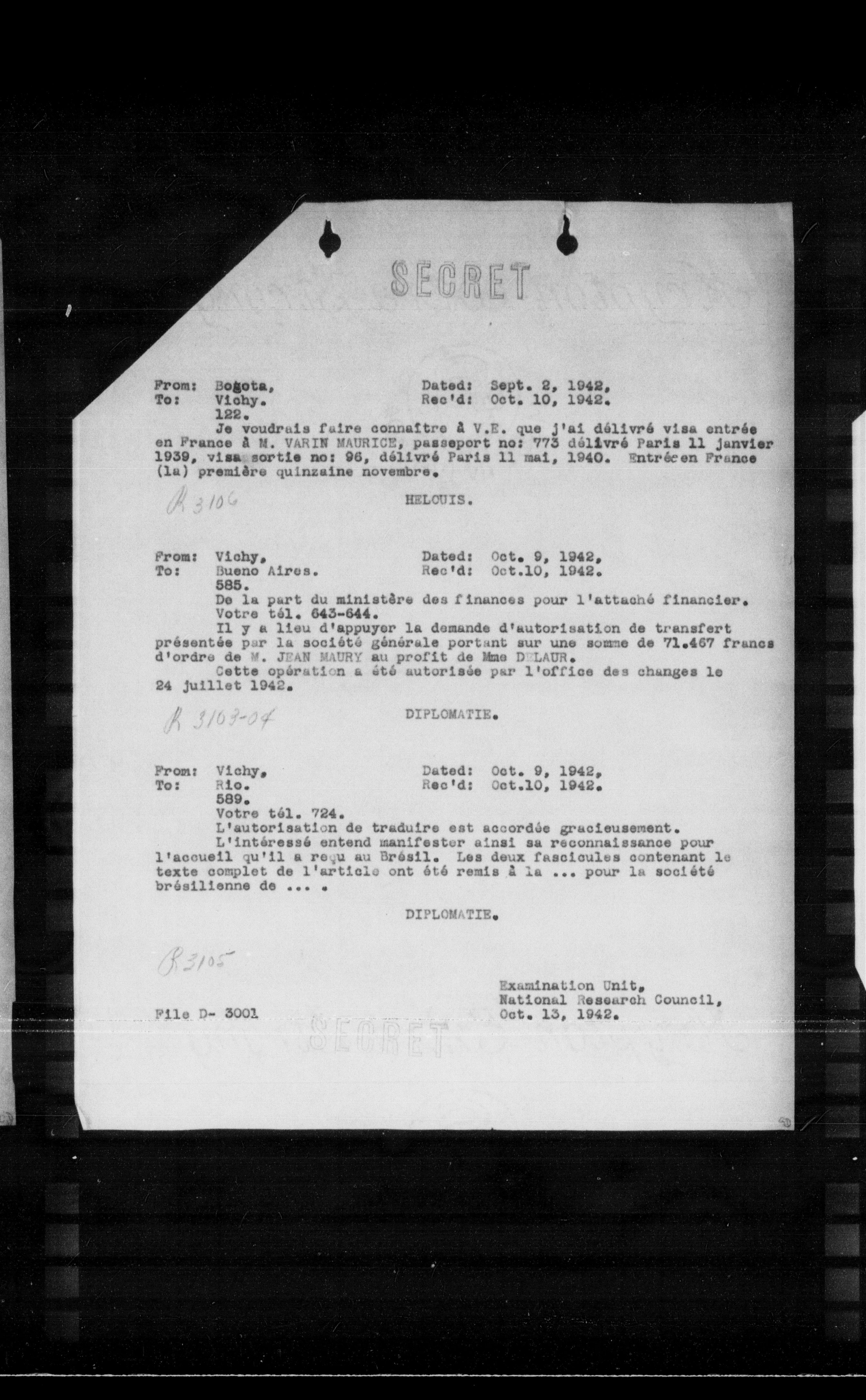 **From:** Vichy, To: Bueno Aires. 585. 305. 2, 1942, Rec'd: Oct. 10, 1942. 585. De la part du ministère des finances pour l'attaché financier. Votre tél. 643-644. Il y a lieu d'appuyer la demande d'autorisation de transfert présentée par la société générale portant sur une somme de 71.467 francs d'ordre de M. JEAN MADRY au profit de Mme DELAUR. Cette opération a été autorisée par l'office des changes le 24 juillet 1942.