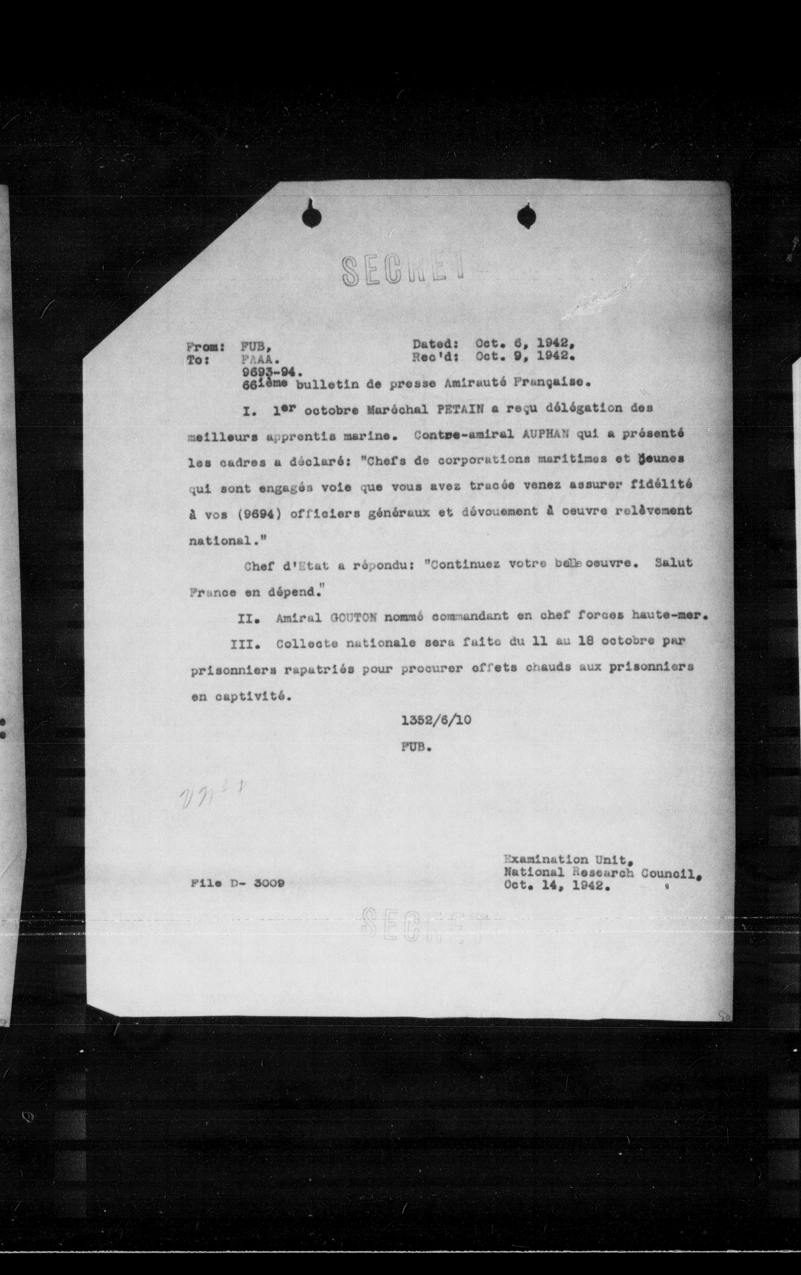 I. 1er octobre Maréchal PETAIN a reçu délégation des meilleurs apprentis marine. Contre-amiral AUPHAN qui a présenté les cadres à déclaré: "Chefs de corporations maritimes et jeunes qui sont engagés vole que vous avez tracée venez assurer fidélité à vos (9694) officiers généraux et dévouement à œuvre relèvement national."