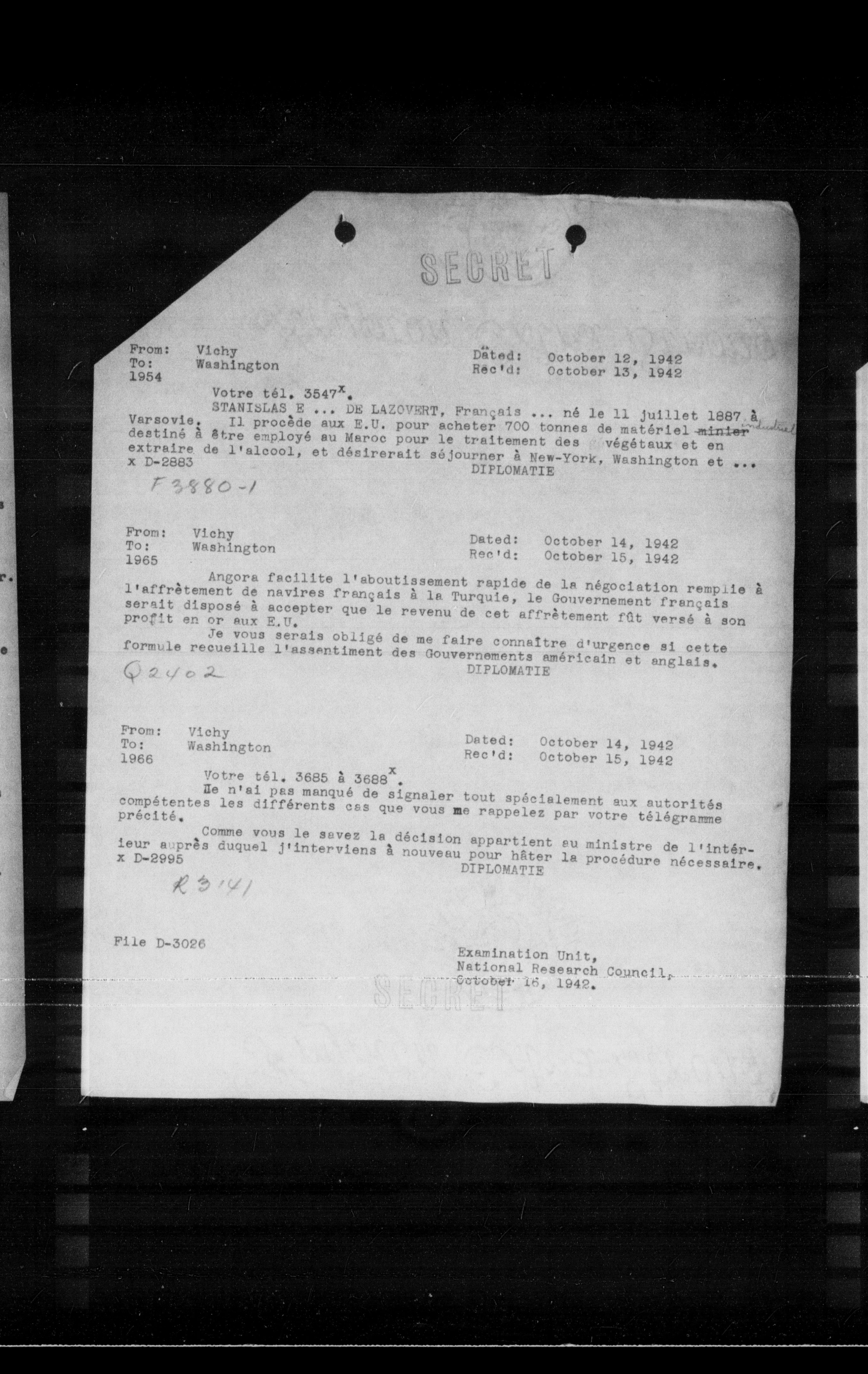 STANISLAS E ... DE LAZOVERT, Prangais ... né le 11 juillet 1887 à Varsovie. Il procède aux E.U. pour acheter 700 tonnes de matériel minier destiné à être employé au Maroc pour le traitement des végétaux et en extraire de l'alcool, et désirerait séjourner à New-York, Washington et ... $x$ D-2883