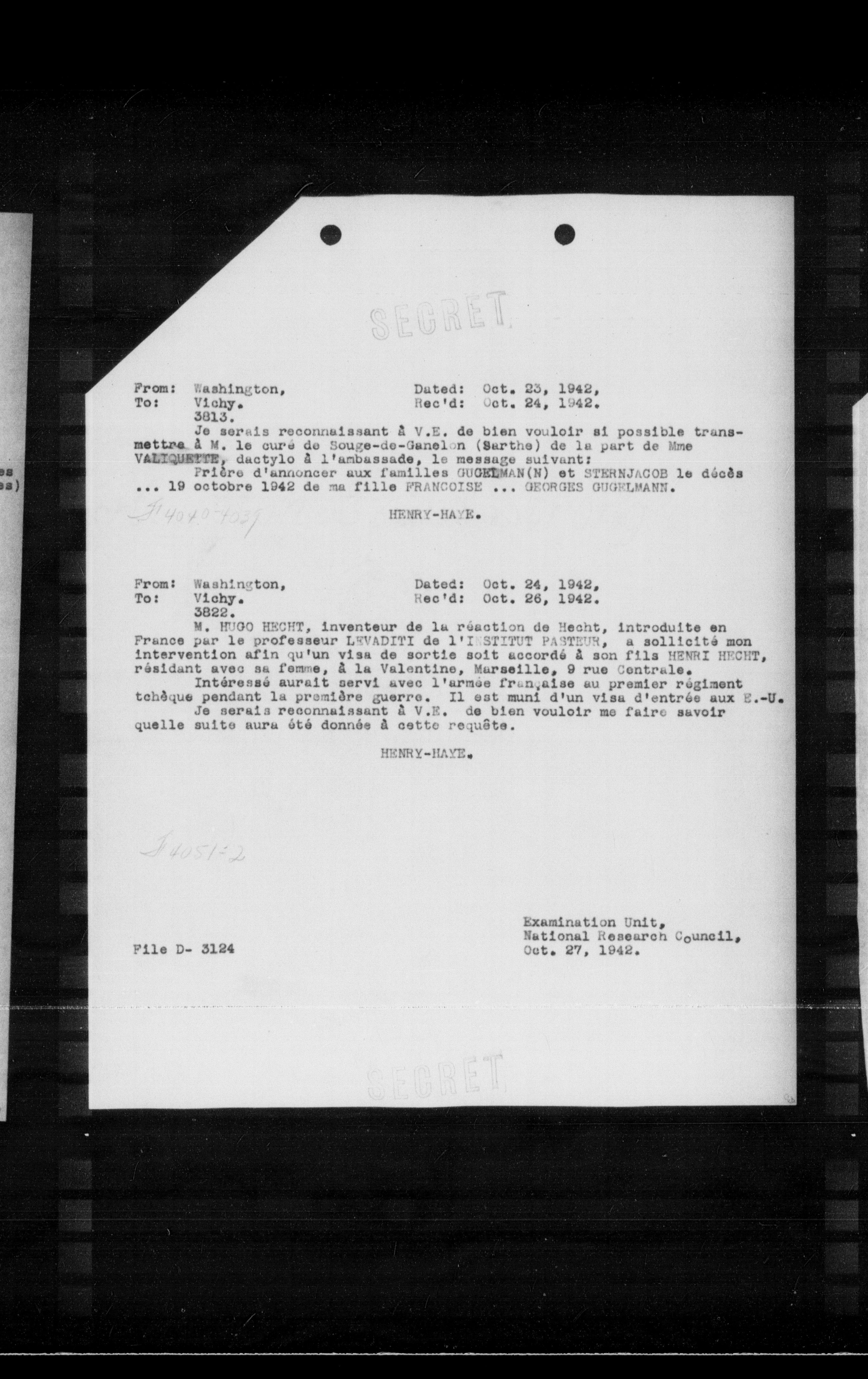 M. HUGO HECHT, inventeur de la réaction de Hecht, introduite en France par le professeur LEVADIYI de l'I:STITUT PASTEUR, a sollicité mon intervention afin qu'un visa de sortie soit accordé à son fils HENRI HECHT, résidant avec sa femme, à la Valentine, Marseille, 9 rue Centrale.