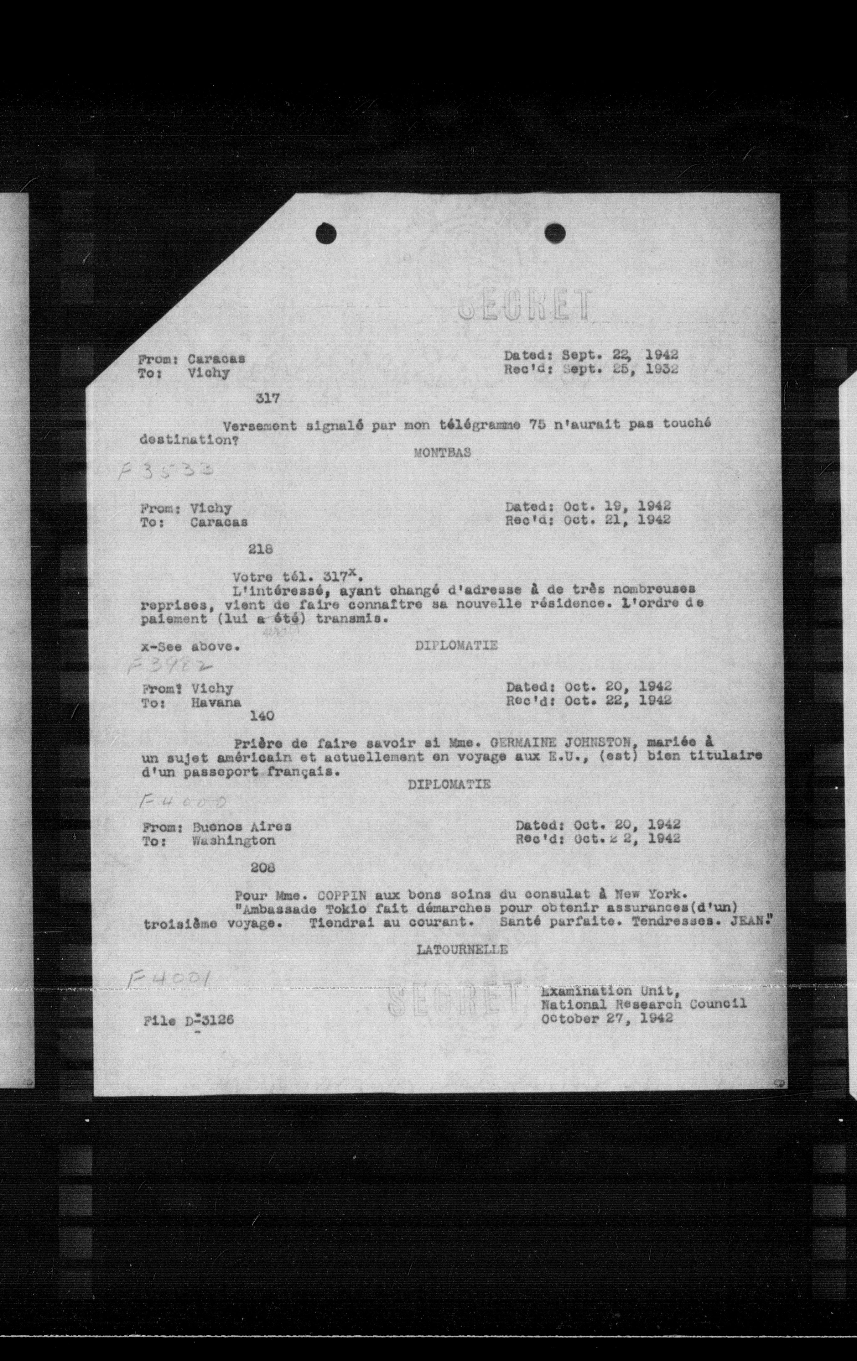 **From:** Vichy **To:** Caracas **Date:** Oct. 19, 1942 **Rec'd:** Oct. 21, 1942