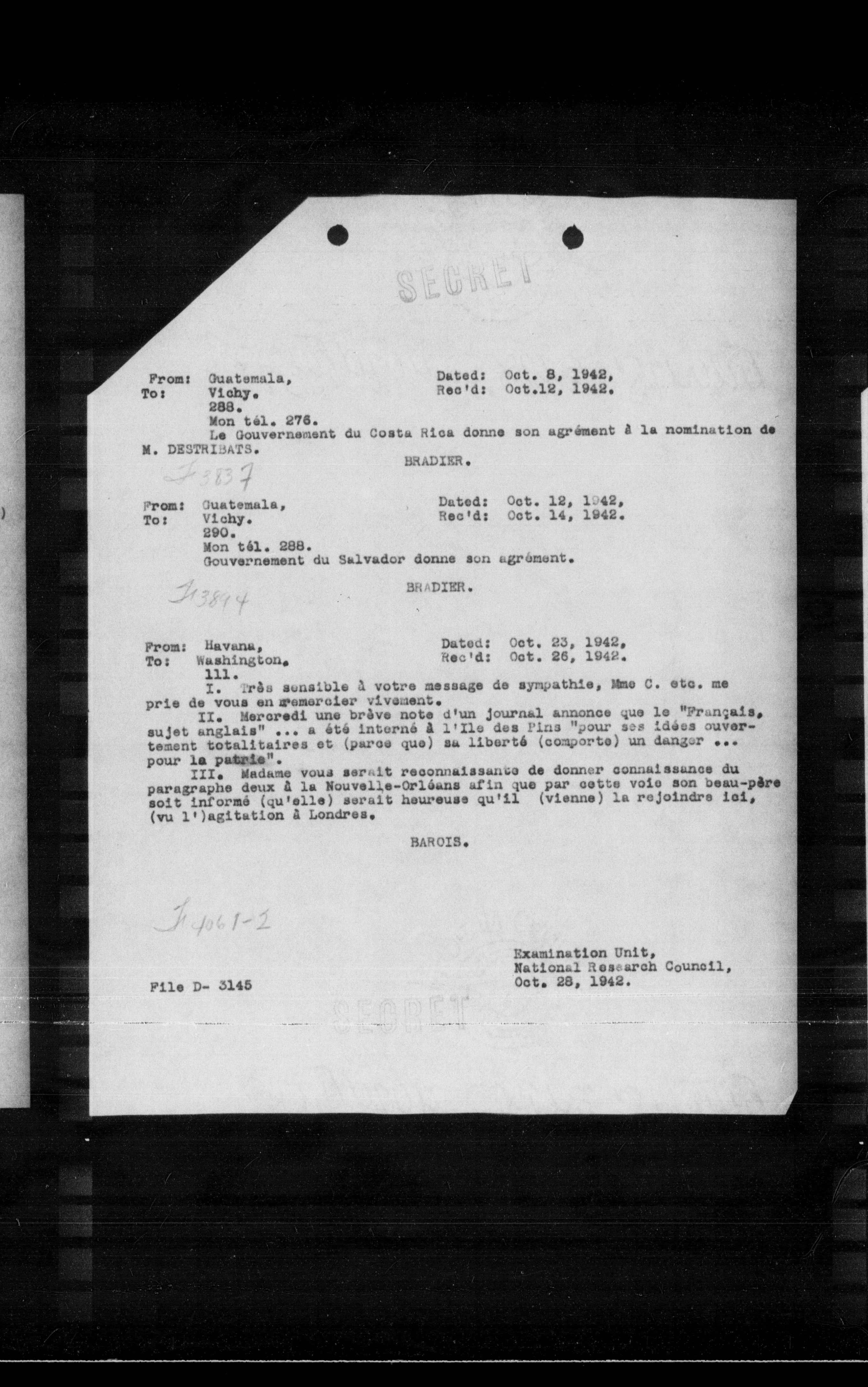 **From:** Guatemala, **Date:** Oct. 12, 1942, **To:** Vichy, **Rec'd:** Oct. 14, 1942, **200.** Mon tél. 288. Gouvernement du Salvador donne son agrément.