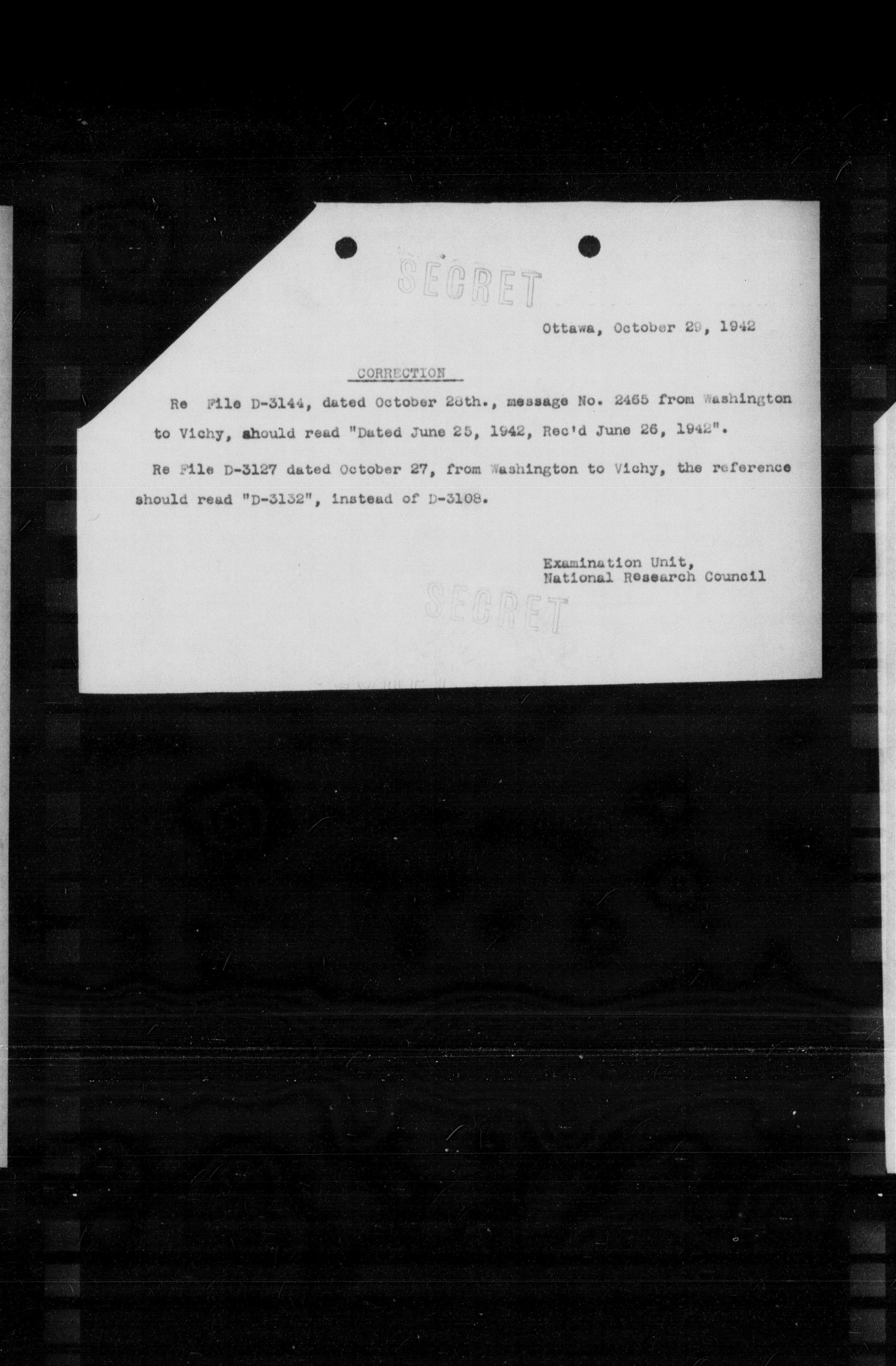 Re File D-3144, dated October 20th., message No. 2465 from Washington to Vichy, should read "Dated June 25, 1942, Rec'd June 26, 1942".