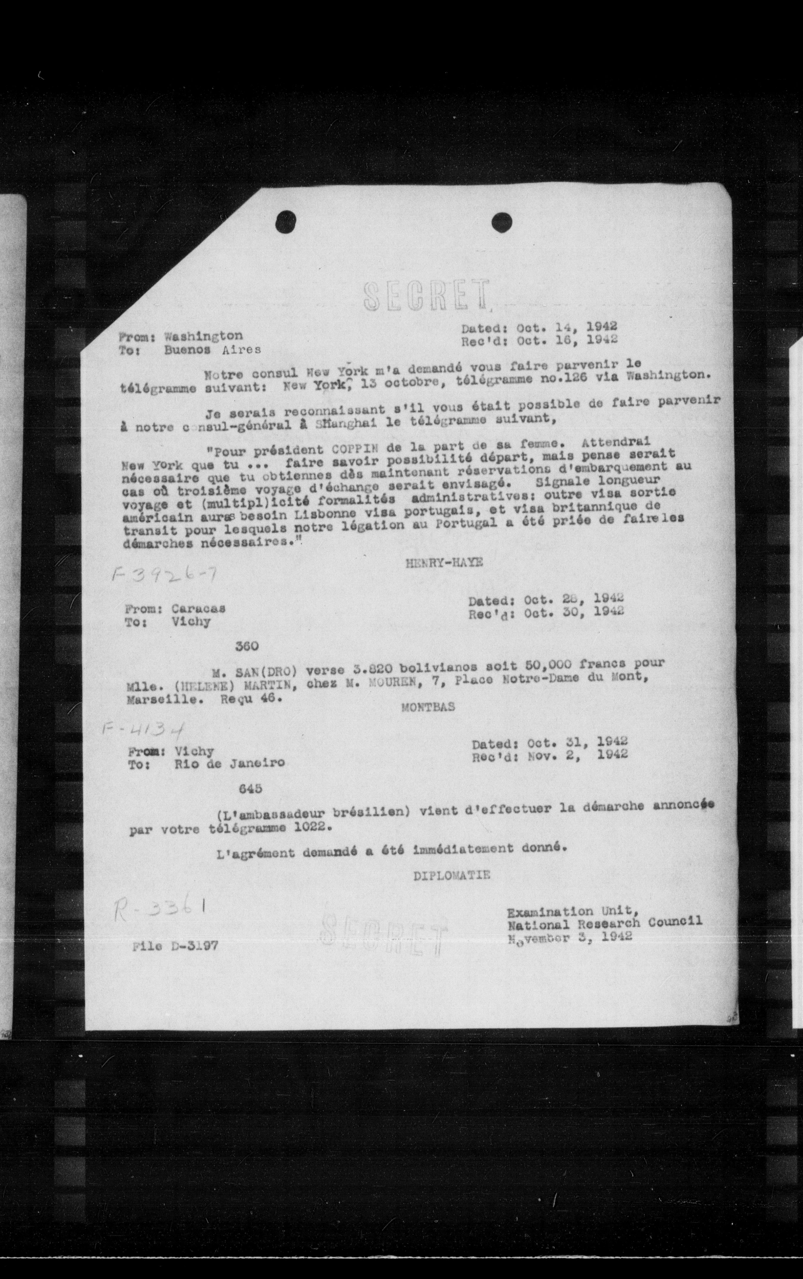New York que tu ... faire savoir possibilité départ, mais pense serait nécessaire que tu obtiennes des maintenant réservations d'embarquement au cas où troisième voyage d'échange serait envisagé. Signale longueur voyage et (multipl)icité formalités administratives: outre visa sortie américain aura besoin Lisbonne visa portugais, et visa britannique de transit pour lesquels notre légation au Portugal a été priée de faireles démarches nécessaires."