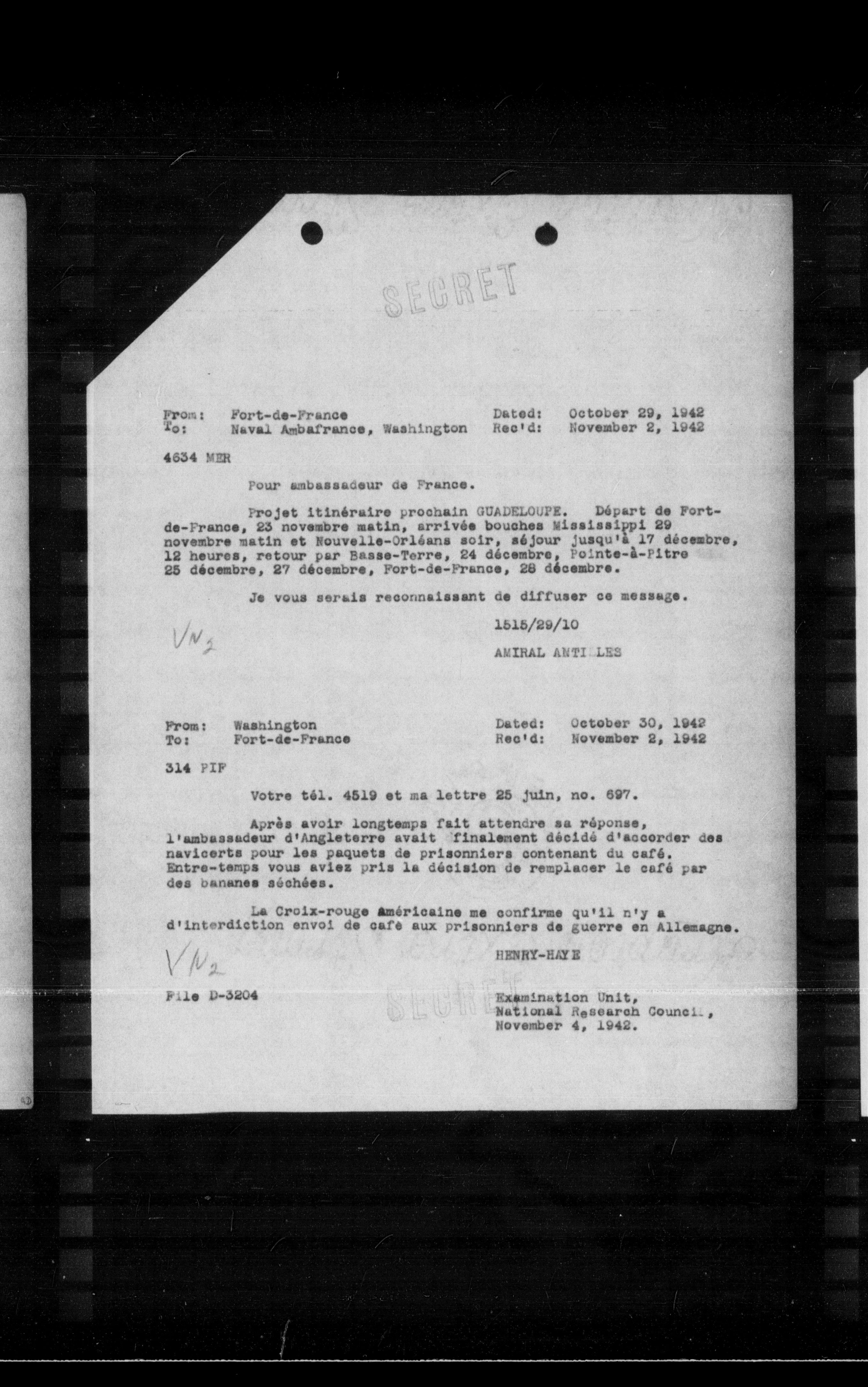 Après avoir longtemps fait attendre sa réponse, l'ambassadeur d'Angleterre avait finalement décidé d'accorder des navicerts pour les paquets de prisonniers contenant du café. Entre-temps vous aviez pris la décision de remplacer le café par des bananes séchées.