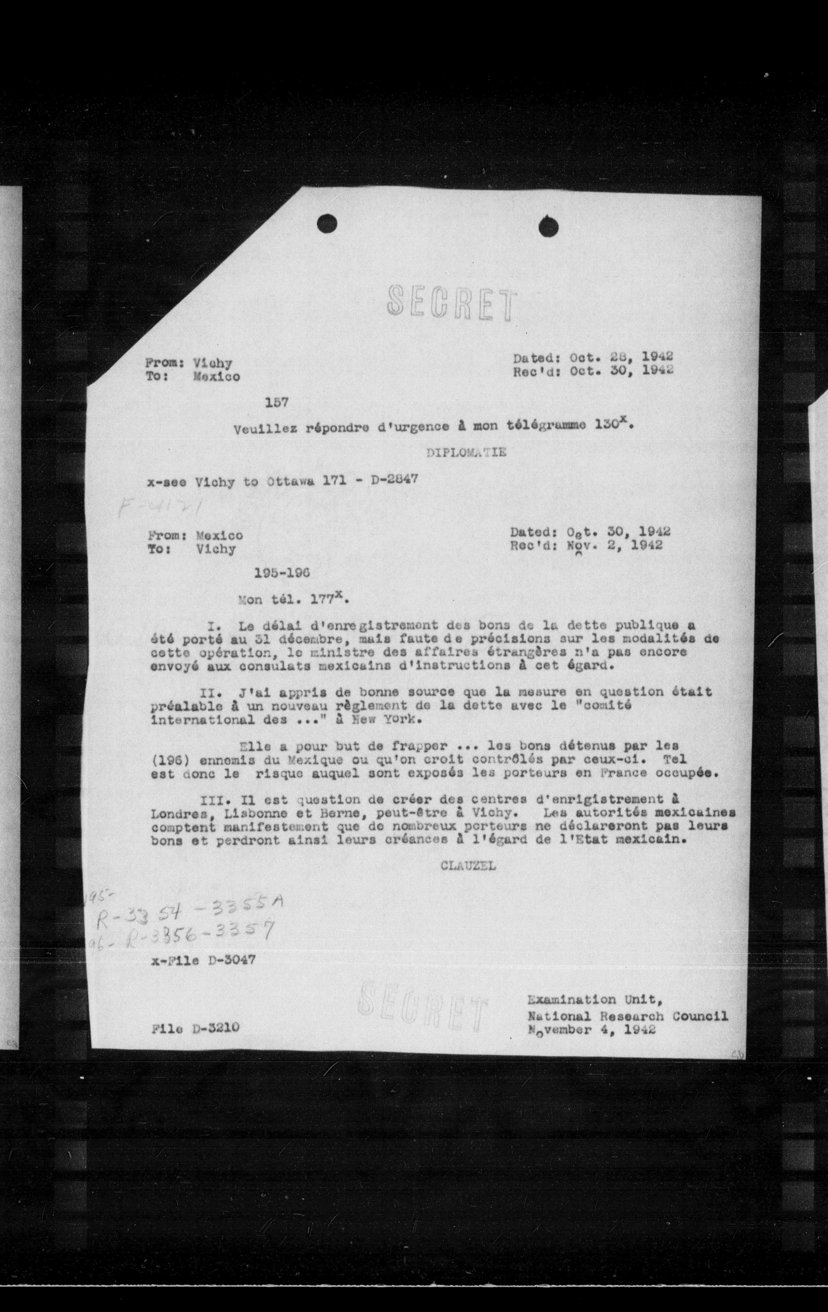 III. Il est question de créer des centres d'enregistrement à Londres, Lisbonne et Berne, peut-être à Vichy. Les autorités mexicaines comptent manifestement que de nombreux porteurs ne déclareront pas leurs bons et perdront ainsi leurs créances à l'égard de l'État mexicain.